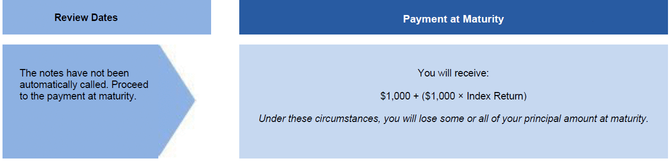 Call Settlement Dates*: October 5, 2026, December 31, 2026, March 31, 2027, June 30, 2027, September 30, 2027, December 30, 2027, March 30, 2028, June 29, 2028, September 28, 2028, December 29, 2028, March 29, 2029, June 28, 2029, September 28, 2029, December 31, 2029, March 28, 2030, June 28, 2030 and the Maturity Date Maturity Date*: September 30, 2030 Automatic Call: If the closing level of the Index on any Review Date is greater than or equal to the applicable Call Value, the notes will be automatically called for a cash payment, for each $1,000 principal amount note, equal to (a) $1,000 plus (b) the Call Premium Amount applicable to that Review Date, payable on the applicable Call Settlement Date. No further payments will be made on the notes. Payment at Maturity: If the notes have not been automatically called (and therefore the Final Value is less than the Barrier Amount), your payment at maturity per $1,000 principal amount note will be calculated as follows: $1,000 + ($1,000 × Index Return) If the notes have not been automatically called (and therefore the Final Value is less than the Barrier Amount), you will lose more than 40.00% of your principal amount at maturity and could lose all of your principal amount at maturity. Index Return: (Final Value – Initial Value) Initial Value: The closing level of the Index on the Pricing Date, which was 3,832.60 Final Value: The closing level of the Index on the final Review Date * Subject to postponement in the event of a market disruption event and as described under “Supplemental Terms of the Notes — Postponement of a Determination Date — Notes Linked Solely to an Index” in the accompanying underlying supplement and “General Terms of Notes — Postponement of a Payment Date” in the accompanying product supplement |