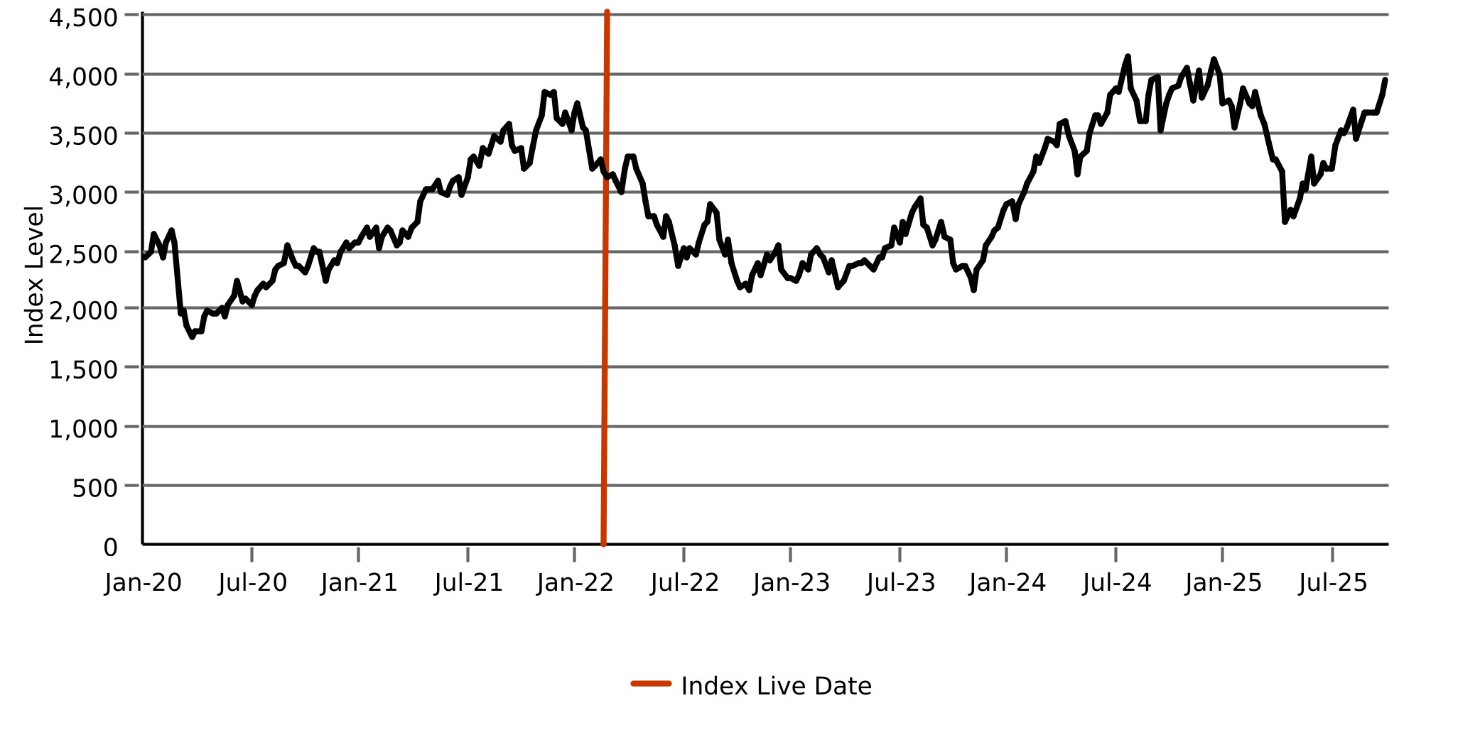 The following graph sets forth the hypothetical back-tested performance of the Index based on the hypothetical back-tested weekly closing levels of the Index from January 3, 2020 through February 4, 2022, and the historical performance of the Index based on the weekly historical closing levels of the Index from February 11, 2022 through September 19, 2025. The Index was established on February 11, 2022, as represented by the vertical line in the following graph. All data to the left of that vertical line reflect hypothetical back-tested performance of the Index. All data to the right of that vertical line reflect actual historical performance of the Index. The closing level of the Index on September 25, 2025 was 3,832.60. We obtained the closing levels above and below from the Bloomberg Professional® service ("Bloomberg"), without independent verification.