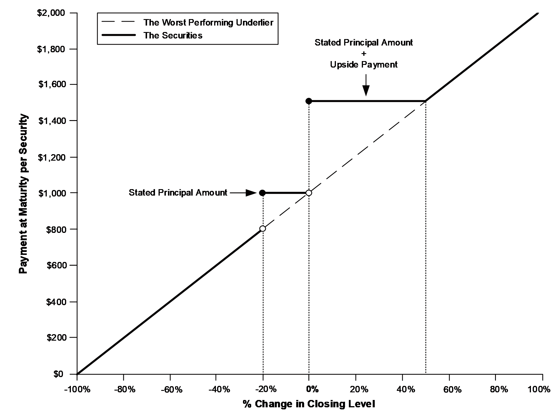 ■Upside Scenario. If the final level of the worst performing underlier is greater than or equal to its initial level, investors will receive the stated principal amount plus the greater of (i) the stated principal amount multiplied by the underlier percent change of the worst performing underlier and (ii) the upside payment per security.