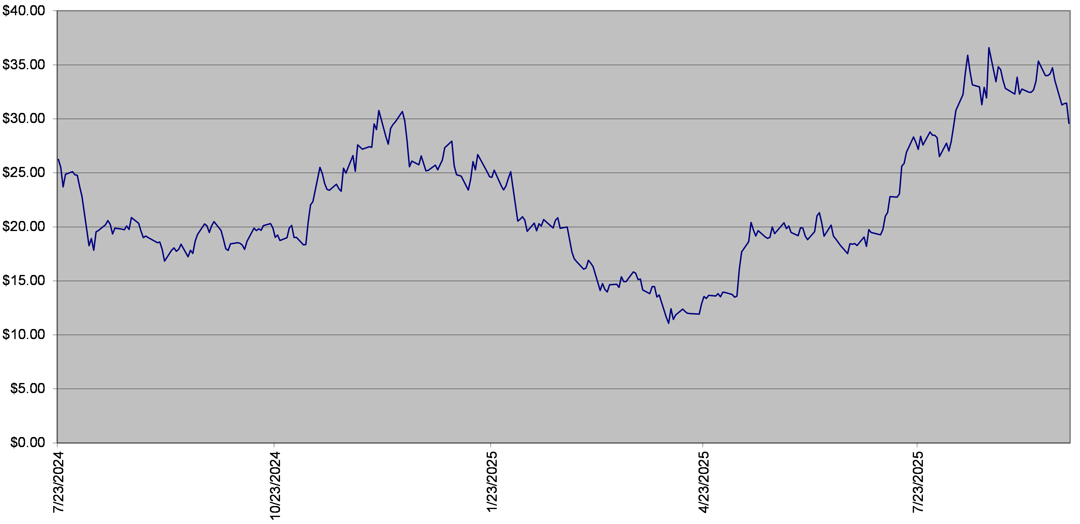 The closing level of the underlier on September 25, 2025 was $29.58. The following graph sets forth the daily closing levels of the underlier for the period noted below. We obtained the historical information presented in this document from Bloomberg Financial Markets, without independent verification. The underlier has at times experienced periods of high volatility. You should not take the historical closing levels of the underlier as an indication of its future performance, and no assurance can be given as to the closing level of the underlier at any time.