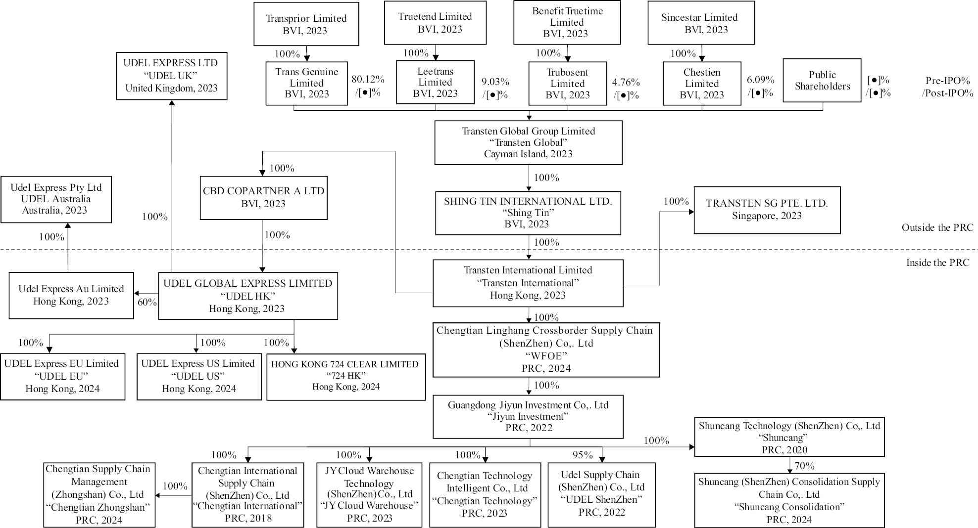 Supply Chain Management (Zhongshan) Co., Ltd, a PRC corporation formed on June 25, 2024 and wholly owned subsidiary of Chengtian International; “UDEL Shenzhen” refers to Udel Supply Chain (Shenzhen) Co., LTD, a PRC corporation and subsidiary of Jiyun Investment; “Shuncang” refers to Shuncang Technology (Shenzhen) Co., Ltd., a PRC corporation and wholly owned subsidiary of Jiyun Investment; “Shuncang Consolidation” refers to Shuncang (ShenZhen) Consolidation Supply Chain Co., Ltd, a PRC corporation and subsidiary of Shuncang; and “PRC operating entities” refers to all our operating entities in the PRC, namely Jiyun Investment, Chengtian Technology, Chengtian International, Chengtian Zhongshan, JY Cloud Warehouse, UDEL Shenzhen, Shuncang, and Shuncang Consolidation; “UDEL HK” refers to UDEL GLOBAL EXPRESS LIMITED, a company formed under the laws of Hong Kong, which is wholly owned by CBD COPARTNER A LTD., a wholly owned subsidiary of Transten International; “724 HK” refers to HONG KONG 724 Clear Limited, a company formed under the laws of Hong Kong, which is wholly owned by UDEL HK; “UDEL US” refers to UDEL Express US Limited, a company formed under the laws of Hong Kong, which is wholly owned by UDEL HK; “UDEL EU” refers to UDEL Express EU Limited, a company formed under the laws of Hong Kong, which is wholly owned by UDEL HK; “UDEL AU” refers to UDEL Express AU Limited, a company formed under the laws of Hong Kong, which is 60% owned by UDEL HK; “UDEL UK” refers to Udel Express Ltd., a company formed under the laws of England and Wales, which is wholly owned by UDEL HK; “UDEL Australia” refers to Udel Express Pty. Ltd., a company formed under the laws of Australia, which is wholly owned by UDEL AU; “TRANSTEN SG” refers to TRANSTEN SG PTE. LTD., a company formed under the laws of Singapore as a wholly owned subsidiary of Transten International; and “operating entities” refer to, collectively, UDEL UK, UDEL Australia, TRANSTEN SG, and the PRC operating entities. UDEL Australia and TRANSTEN SG currently have minimal operating activities.