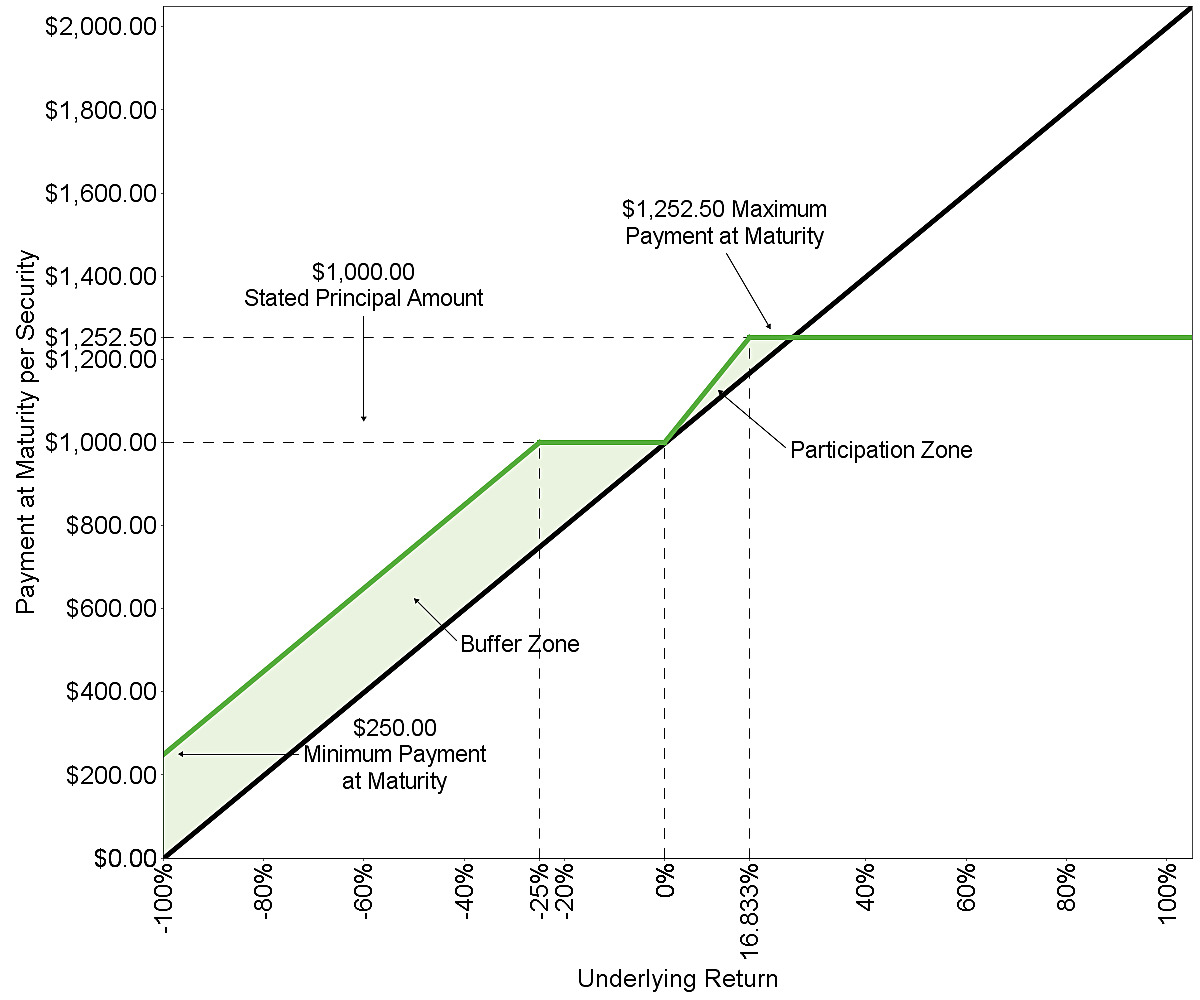 You will receive at maturity for each security you then hold: ■If the final underlying value is greater than the initial underlying value: $1,000 + the return amount, subject to the maximum return at maturity ■If the final underlying value is less than or equal to the initial underlying value but greater than or equal to the final buffer value: $1,000 ■If the final underlying value is less than the final buffer value: $1,000 + [$1,000 × (the underlying return + the buffer percentage)] If the final underlying value is less than the final buffer value, which means that the underlying has depreciated from the initial underlying value by more than the buffer percentage, you will lose 1% of the stated principal amount of your securities at maturity for every 1% by which that depreciation exceeds the buffer percentage. |