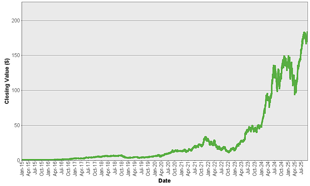 The graph below shows the closing value of NVIDIA Corporation for each day such value was available from January 2, 2015 to September 26, 2025. We obtained the closing values from Bloomberg L.P., without independent verification. If certain corporate transactions occurred during the historical period shown below, including, but not limited to, spin-offs or mergers, then the closing values shown below for the period prior to the occurrence of any such transaction have been adjusted by Bloomberg L.P. as if any such transaction had occurred prior to the first day in the period shown below. You should not take historical closing values as an indication of future performance.