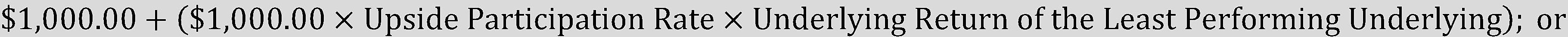 Assuming the Notes are not called prior to maturity, if the Ending Value of each Underlying is greater than or equal to 100% of its Starting Value, at maturity, you will receive 150.00% upside exposure to increases in the value of the Least Performing Underlying from its Starting Value. |