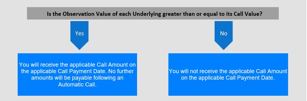Beginning with the November 3, 2026 Call Observation Date, all (but not less than all) of the Notes will be automatically called at an amount equal to the applicable Call Amount if the Observation Value of each Underlying is greater than or equal to its Call Value on any Call Observation Date. If the Notes are automatically called, the applicable Call Amount will be paid on the applicable Call Payment Date. No further amounts will be payable following an Automatic Call. |