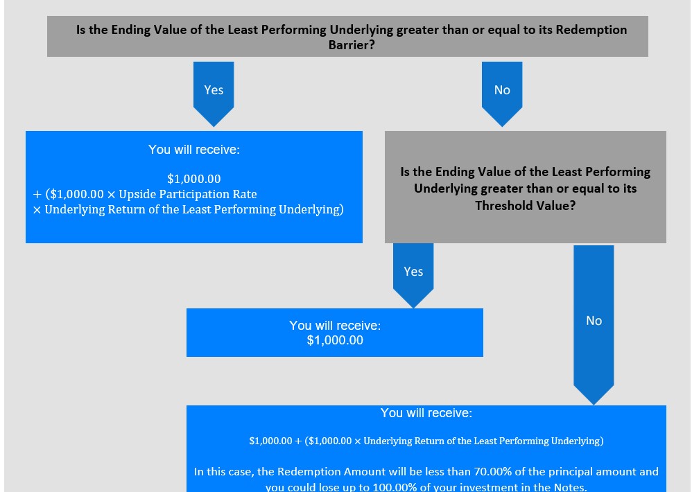 However, assuming the Notes are not called prior to maturity, if any Underlying declines by more than 30% from its Starting Value, at maturity your investment will be subject to 1:1 downside exposure to decreases in the value of the Least Performing Underlying, with up to 100% of the principal at risk. Otherwise, if the Notes are not called prior to maturity and the Ending Value of the Least Performing Underlying is less than 100.00% of its Starting Value but greater than or equal to 70% of its Starting Value, at maturity you will receive the principal amount of your Notes. |