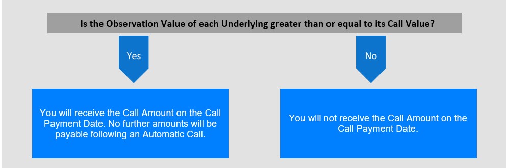 All (but not less than all) of the Notes will be automatically called at an amount equal to the Call Amount if the Observation Value of each Underlying is greater than or equal to its Call Value on the Call Observation Date. If the Notes are automatically called, the Call Amount will be paid on the Call Payment Date. No further amounts will be payable following an Automatic Call. |