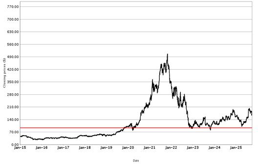 The following graph sets forth historical closing values of the Underlier for the period from January 1, 2015 to September 29, 2025. The red line represents the Coupon Threshold and Barrier Value. We obtained the information in the graph from Bloomberg Financial Markets, without independent investigation. We cannot give you assurance that the performance of the Underlier will result in the return of all of your initial investment.