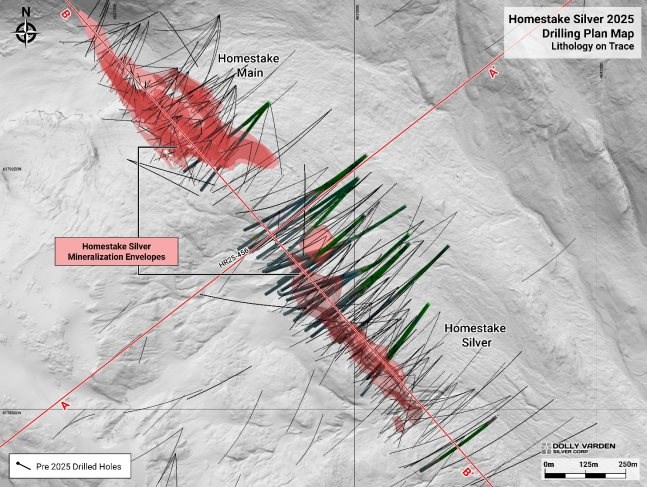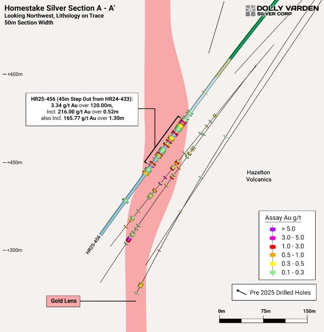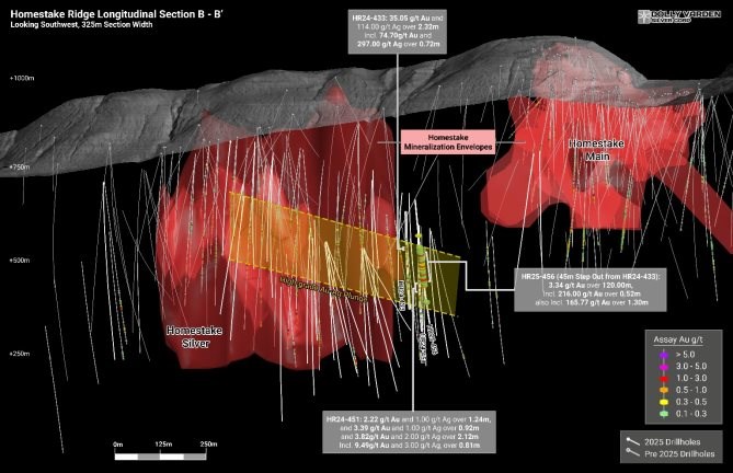 VANCOUVER, BC, October 01, 2025, Dolly Varden Silver Corporation (TSX-V: DV | NYSE MKT: DVS | FSE: DVQ) (the "Company" or "Dolly Varden") is pleased to report a significant gold intercept from a 2025 step-out drill hole at the Homestake Silver deposit. Hole HR25-456 intersected 3.34 g/t Au over 120 meters, including 216 g/t Au over 0.52 meters and 166 g/t Au over 1.3 meters. The hole is a 45-meter step-out along strike from hole HR24-433 and 30 meters up dip from hole HR24-451 (both holes previously released February 3, 2025) confirming both continuity and growth potential outside of current Mineral Resources. Approximately 40% of the 2025 seasons 55,000 meter planned drill program at the Company's 100% owned Kitsault Valley Silver and Gold Project targeted the Homestake Silver Deposit to expand and infill zones of high-grade gold mineralization. The deposit remains open for expansion, with gold mineralization vectoring to the Homestake Main Deposit, along strike to the north of the Homestake Silver Deposit.