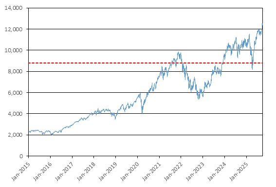 The graph below illustrates the performance of NDXT from January 1, 2015 through September 30, 2025, based on the daily closing levels as reported by Bloomberg, without independent verification. UBS has not conducted any independent review or due diligence of any publicly available information obtained from Bloomberg. The closing level of NDXT on September 30, 2025 was 12,547.11. The dotted line represents its coupon barrier and downside threshold of 8,782.98, which is equal to 70.00% of its initial level. Past performance of the underlying asset is not indicative of the future performance of the underlying asset during the term of the Notes.
