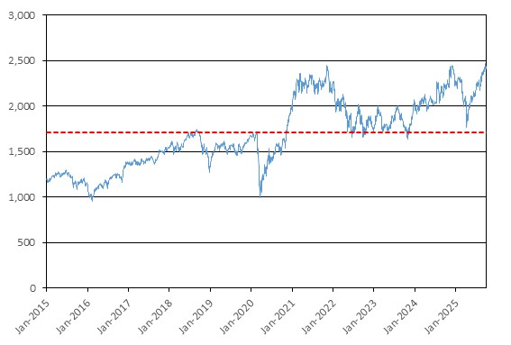 The graph below illustrates the performance of RTY from January 1, 2015 through September 30, 2025, based on the daily closing levels as reported by Bloomberg, without independent verification. UBS has not conducted any independent review or due diligence of any publicly available information obtained from Bloomberg. The closing level of RTY on September 30, 2025 was 2,436.484. The dotted line represents its coupon barrier and downside threshold of 1,705.539, which is equal to 70.00% of its initial level. Past performance of the underlying asset is not indicative of the future performance of the underlying asset during the term of the Notes.