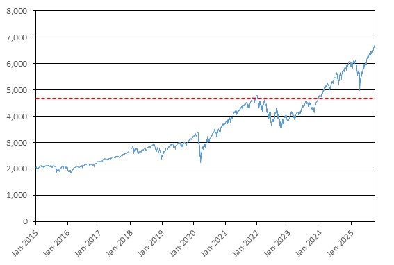 The graph below illustrates the performance of SPX from January 1, 2015 through September 30, 2025, based on the daily closing levels as reported by Bloomberg, without independent verification. UBS has not conducted any independent review or due diligence of any publicly available information obtained from Bloomberg. The closing level of SPX on September 30, 2025 was 6,688.46. The dotted line represents its coupon barrier and downside threshold of 4,681.92, which is equal to 70.00% of its initial level. Past performance of the underlying asset is not indicative of the future performance of the underlying asset during the term of the Notes.