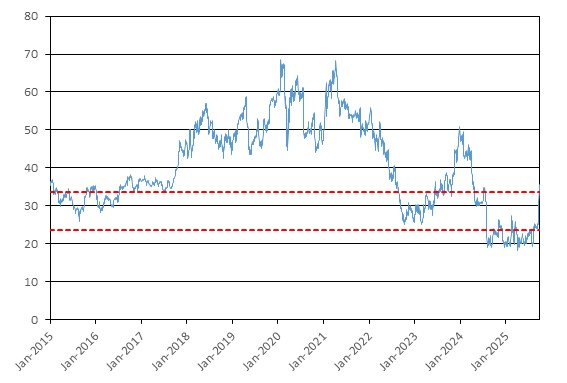 The graph below illustrates the performance of Intel’s common stock from January 1, 2015 through September 30, 2025, based on the daily closing levels as reported by Bloomberg, without independent verification. UBS has not conducted any independent review or due diligence of any publicly available information obtained from Bloomberg. The closing level of Intel’s common stock on September 30, 2025 was $33.55. The dotted lines respectively represent the call threshold level of $33.55, which is equal to 100.00% of the initial level, and the coupon barrier and downside threshold of $23.49, which is equal to 70.00% of the initial level. Past performance of the underlying asset is not indicative of the future performance of the underlying asset during the term of the Notes.