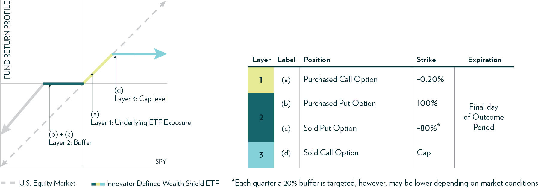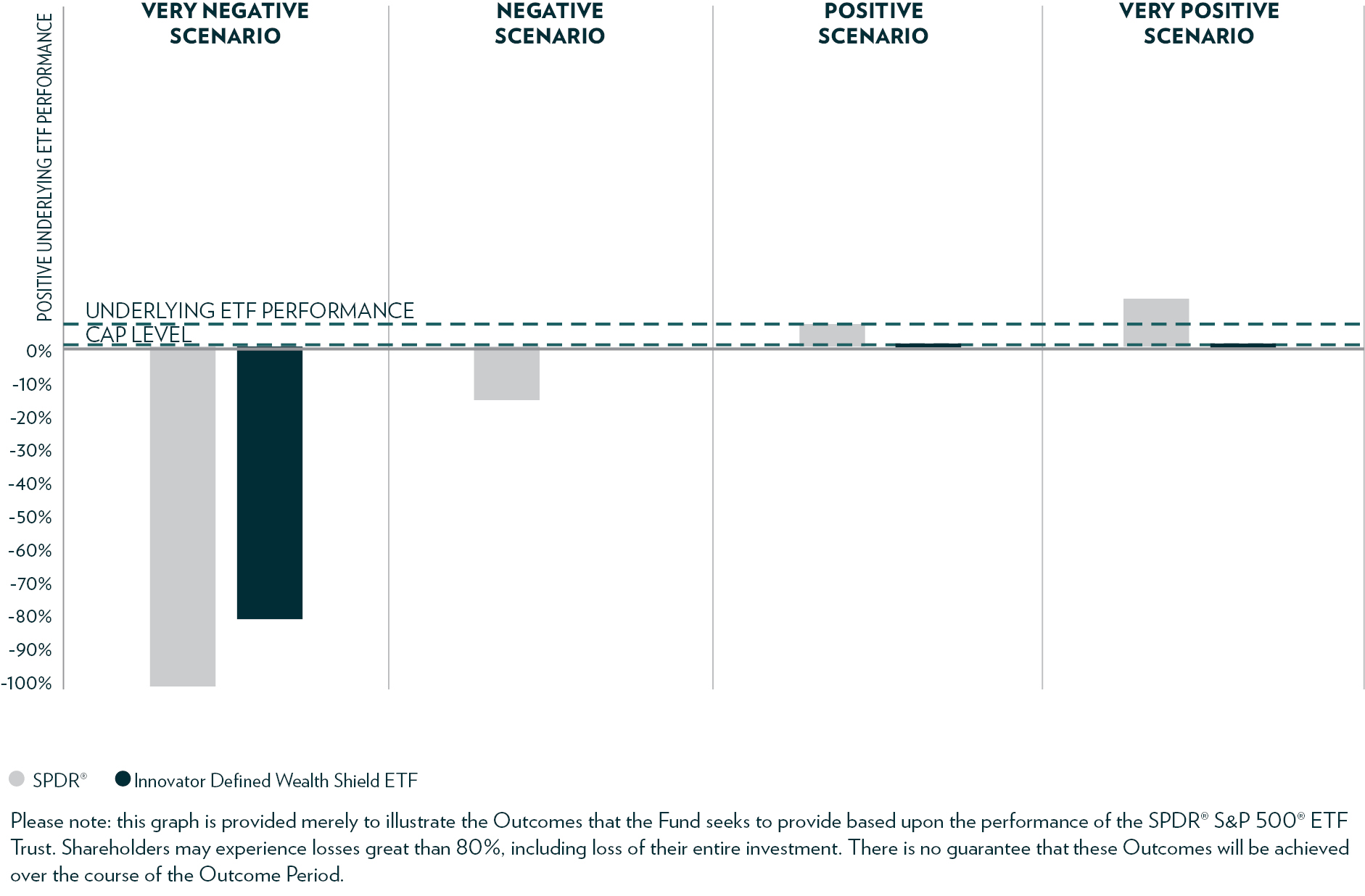 The Fund’s “Defined Wealth Shield” investment strategy seeks to buffer losses over the course of the Outcome Period while simultaneously generating returns that match the Underlying ETF, up to the Cap (discussed in detail below), while limiting downside losses. The hypothetical graphical illustration provided below is designed to illustrate the Outcomes that the Fund seeks to provide for investors who hold Fund Shares for the entirety of the Outcome Period. There is no guarantee that the Fund will be successful in its attempt to provide the Outcomes for an Outcome Period. The returns that the Fund seeks to provide do not include the costs associated with purchasing Fund Shares and certain expenses incurred by the Fund.