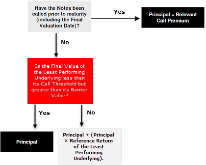 Unless the Notes are called, for each $1,000 Principal Amount, you will receive a cash payment on the Maturity Date, calculated as follows: If the Reference Return of the Least Performing Underlying is less than 0.00%, and therefore not called, but greater than or equal to -30.00%: $1,000 (a zero return) If the Reference Return of the Least Performing Underlying is less than -30.00%: $1,000 + ($1,000 × Reference Return of the Least Performing Underlying). If the Notes are not called and the Final Value of the Least Performing Underlying is less than its Barrier Value, you will not receive a Call Premium, and will lose up to 100% of the Principal Amount. |