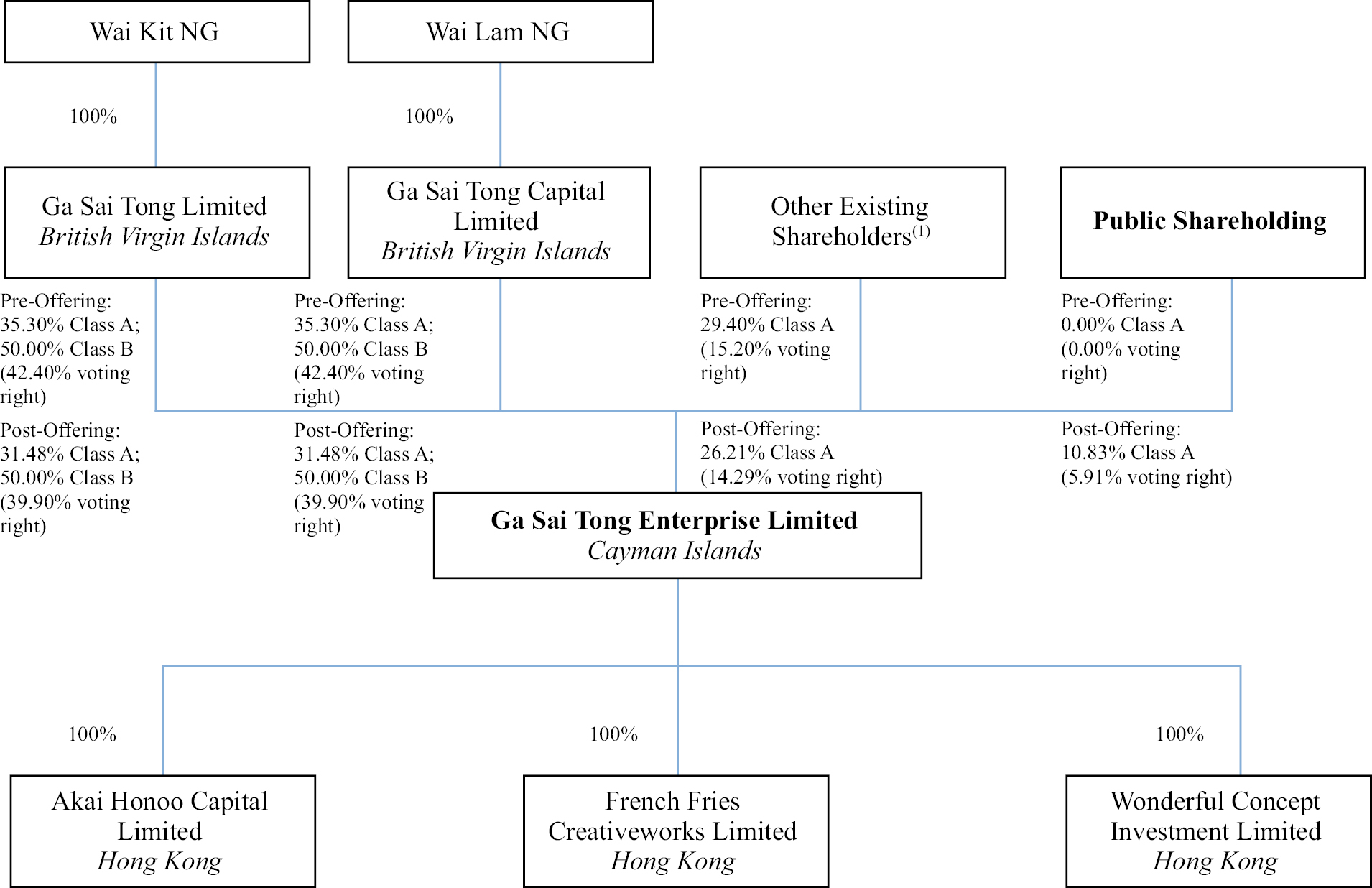 We are not a Hong Kong operating company, but an offshore holding company incorporated in the Cayman Islands. As a holding company with no material operations of our own, we conduct our operations through our operating companies in Hong Kong, Akai Honoo Capital Limited (“Akai Honoo Capital”), French Fries Creativework (“French Fries Creativework”) and Wonderful Concept Investment Limited (“Wonderful Concept”) (together, “Hong Kong Operating Subsidiaries”). This is an offering of the Class A Ordinary Shares of Ga Sai Tong Enterprise Limited, the holding company in the Cayman Islands, instead of the shares of Akai Honoo Capital, French Fries Creativework and Wonder Concept. References to the “Company”, “we”, “us”, and “our” in this prospectus are to GST Cayman, the Cayman Islands entity that will issue the Class A Ordinary Shares being offered. References to Akai Honoo Capital, French Fries Creativework and Wonder Concept in this prospectus are to the Hong Kong Operating Subsidiaries operating the business and generating all of the revenue and profit stated in the consolidated financial statements of the Company. Investors in our Class A Ordinary Shares should be aware that they may never hold equity interests in the Hong Kong Operating Subsidiaries directly. Investors are purchasing equity solely in GST Cayman, our Cayman Islands holding company, which owns equity interests in the Hong Kong Operating Subsidiaries. Because of our corporate structure, we, as well as our investors are subject to unique risks due to uncertainty of the interpretation and the application of PRC laws and regulations. We are also subject to the risks of uncertainty about any future actions of the PRC government in this regard. We may also be subject to sanctions imposed by PRC regulatory agencies, including the China Securities Regulatory Commission (“CSRC”), if we fail to comply with their rules and regulations. PRC regulatory authorities could disallow our operating structure in the