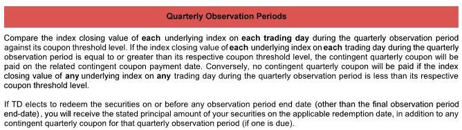 TD may elect at its discretion, on or before any applicable observation period end-date (other than the final observation period end-date), to redeem the securities at its discretion in whole,