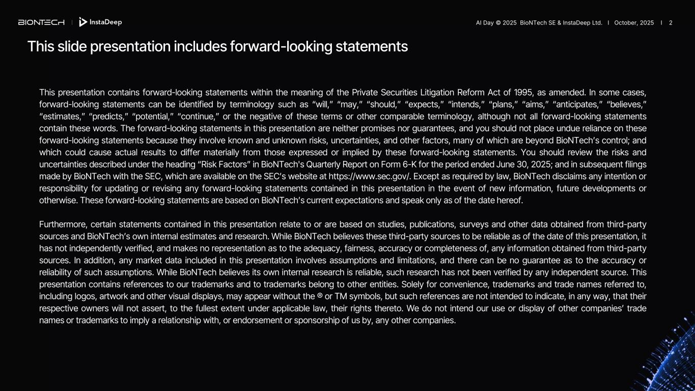 This slide presentation includes forward-looking statements This presentation contains forward-looking statements within the meaning of the Private Securities Litigation Reform Act of 1995, as amended. In some cases, forward-looking statements can be identified by terminology such as “will,” “may,” “should,” “expects,” “intends,” “plans,” “aims,” “anticipates,” “believes,” “estimates,” “predicts,” “potential,” “continue,” or the negative of these terms or other comparable terminology, although not all forward-looking statements contain these words. The forward-looking statements in this presentation are neither promises nor guarantees, and you should not place undue reliance on these forward-looking statements because they involve known and unknown risks, uncertainties, and other factors, many of which are beyond BioNTech’s control; and which could cause actual results to differ materially from those expressed or implied by these forward-looking statements. You should review the risks and uncertainties described under the heading “Risk Factors” in BioNTech's Quarterly Report on Form 6-K for the period ended June 30, 2025; and in subsequent filings made by BioNTech with the SEC, which are available on the SEC’s website at https://www.sec.gov/. Except as required by law, BioNTech disclaims any intention or responsibility for updating or revising any forward-looking statements contained in this presentation in the event of new information, future developments or otherwise. These forward-looking statements are based on BioNTech’s current expectations and speak only as of the date hereof. Furthermore, certain statements contained in this presentation relate to or are based on studies, publications, surveys and other data obtained from third-party sources and BioNTech’s own internal estimates and research. While BioNTech believes these third-party sources to be reliable as of the date of this presentation, it has not independently verified, and makes no representation as to the adequacy, fairness, accuracy or completeness of, any information obtained from third-party sources. In addition, any market data included in this presentation involves assumptions and limitations, and there can be no guarantee as to the accuracy or reliability of such assumptions. While BioNTech believes its own internal research is reliable, such research has not been verified by any independent source. This presentation contains references to our trademarks and to trademarks belong to other entities. Solely for convenience, trademarks and trade names referred to, including logos, artwork and other visual displays, may appear without the ® or TM symbols, but such references are not intended to indicate, in any way, that their respective owners will not assert, to the fullest extent under applicable law, their rights thereto. We do not intend our use or display of other companies’ trade names or trademarks to imply a relationship with, or endorsement or sponsorship of us by, any other companies. AI Day © 2025 BioNTech SE & InstaDeep Ltd. I October, 2025 I 2