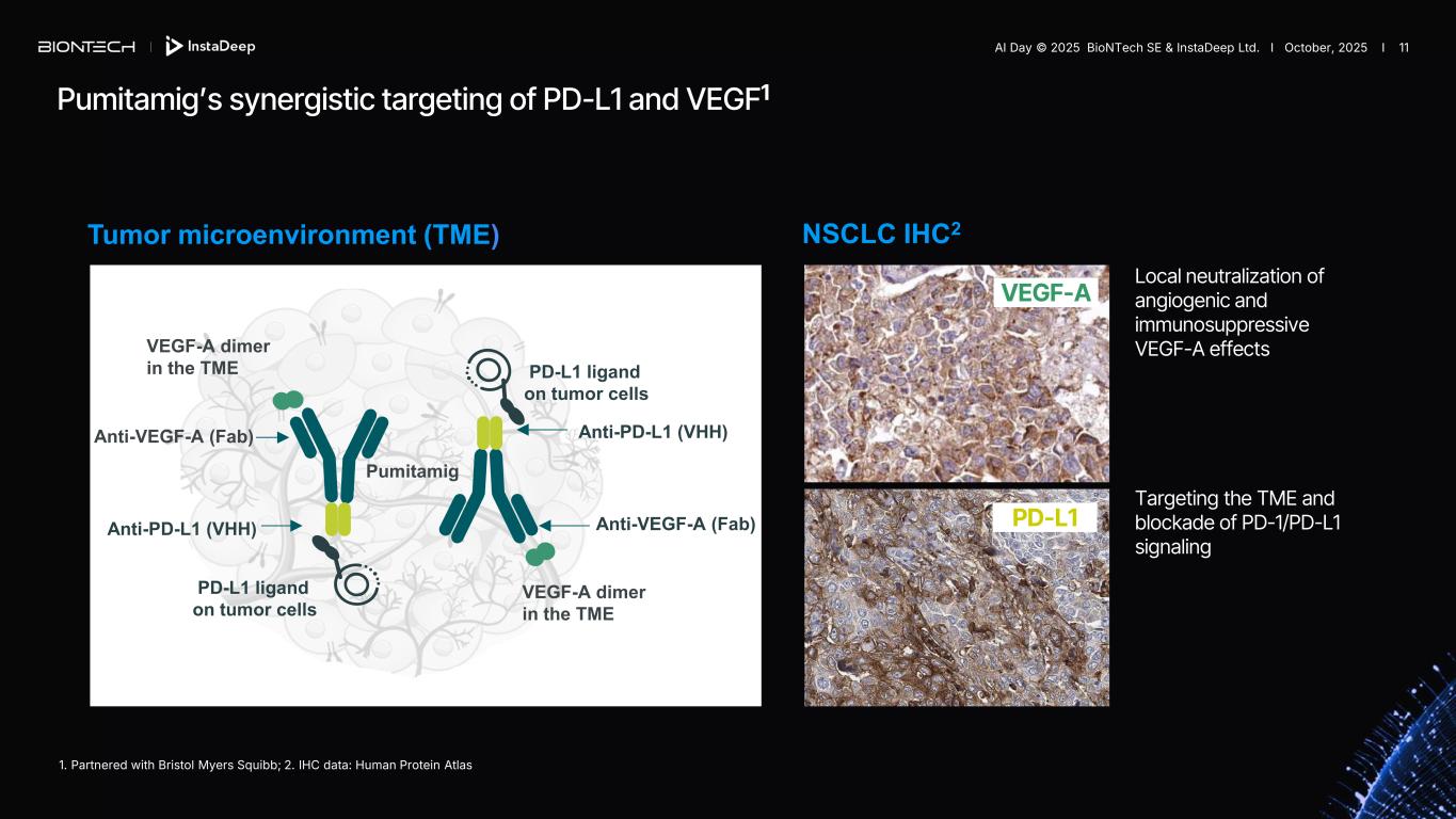 Potential for synergy mRNA cancer immuno- therapies Targeted therapies We are uniquely positioned to combine approaches to transform cancer care ADC = antibody-drug conjugate. Immunomodulators • Focus on the critical IO pathways • Targeting different complementary pathways in cancer immunity cycle may promote a durable anti-tumor effect • BNT327 pumitamig mRNA cancer immunotherapies • Eliminate polyclonal residual disease with multi-antigen and individualized approaches • Polyspecific activity by targeting multiple antigens at once • Establish long-lasting immunological memory to prevent relapses Targeted therapies • Precise and potent modalities for fast onset tumor reduction • ADC as potential “augmenters” of immunomodulators and mRNA cancer immunotherapies • Focus on HER2, HER3, TROP2, B7H3 ADCs as combination partners AI Day © 2025 BioNTech SE & InstaDeep Ltd. I October, 2025 I 10 Immunomodulators Potentially curative approaches Potential for synergy Potential for synergy