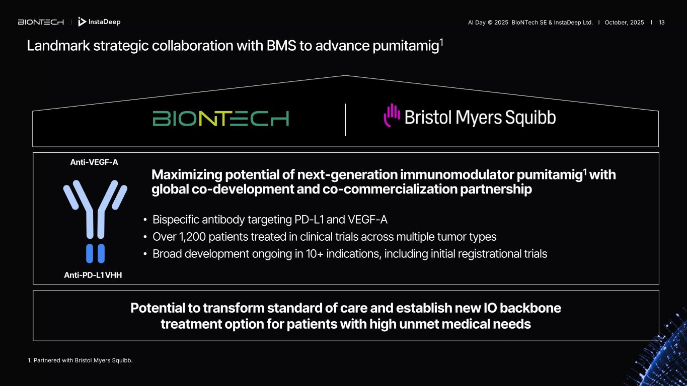 Anti-PD-L1 Anti-VEGF >1.4 M estimated new cancer cases in the US and EU annually that cannot be addressed by current IO therapies Anti-PD-(L)1 approved Anti-PD-(L)1 not approved US and EU cancer incidence2 1. NCI SEER https://training.seer.cancer.gov/index.html. 2.US incidence source: NIH and American Cancer Society data EU incidence source: European Cancer Information System Next-generation bispecific can potentially expand the reach of IO therapy Breast (non TNBC) TNBC PD-L1 CRC (MSS) EGFRmut NSCLC Pancreatic Ovarian GBM Lung Melanoma RCC Endometrial HNSCC/nasopharyngeal TNBC PD-L1 >10% HCC Gastric CRC (MSI-H) Anti-PD-(L)1 therapy addresses ~1.5 M new cancer cases in the US and EU annually with medical need remaining high (5-year survival < 50%)1 AI Day © 2025 BioNTech SE & InstaDeep Ltd. I October, 2025 I 12