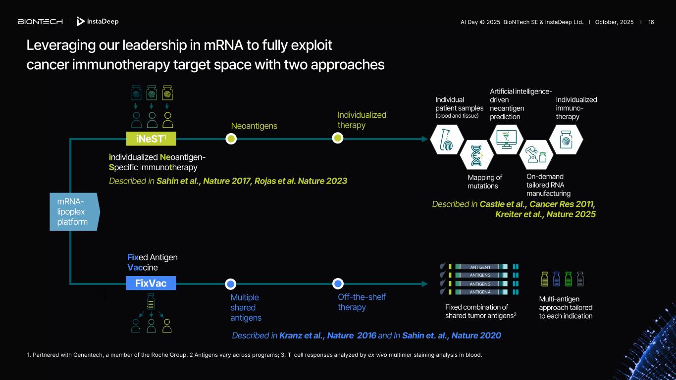 Targeted therapies Immunomodulators Potential for synergy We are uniquely positioned to combine approaches to transform cancer care ADC = antibody-drug conjugate. Immunomodulators • Focus on the critical IO pathways • Targeting different complementary pathways in cancer immunity cycle may promote a durable anti-tumor effect • BNT327 pumitamig mRNA cancer immunotherapies • Eliminate polyclonal residual disease with multi-antigen and individualized approaches • Polyspecific activity by targeting multiple antigens at once • Establish long-lasting immunological memory to prevent relapses Targeted therapies • Precise and potent modalities for fast onset tumor reduction • ADC as potential “augmenters” of immunomodulators and mRNA cancer immunotherapies • Focus on HER2, HER3, TROP2, B7H3 ADCs as combination partners AI Day © 2025 BioNTech SE & InstaDeep Ltd. I October, 2025 I 15 Potential for synergy Potential for synergy Potentially curative approaches mRNA cancer immuno- therapies