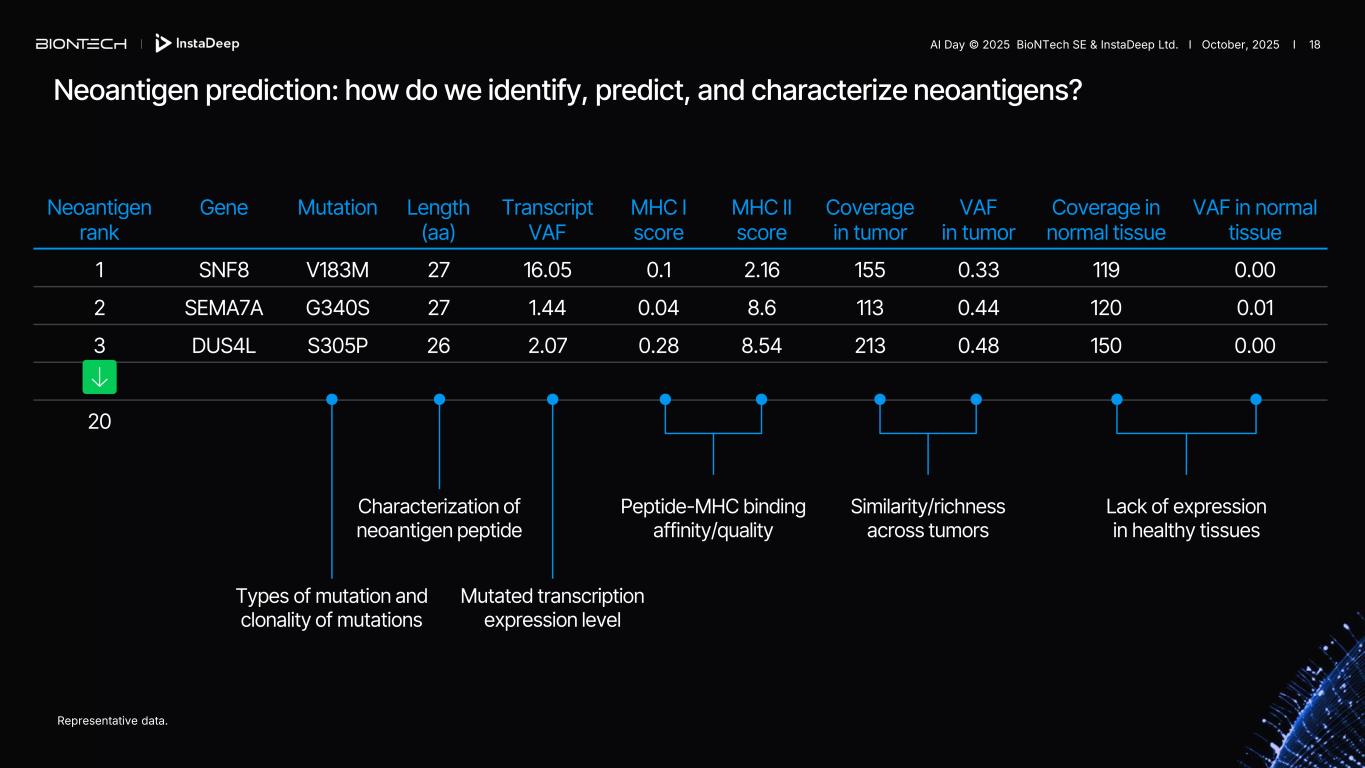 Neoantigen prediction: how do we identify, predict, and characterize neoantigens? Neoantigen rank Gene Mutation Length (aa) Transcript VAF MHC I score MHC II score Coverage in tumor VAF in tumor Coverage in normal tissue VAF in normal tissue 1 SNF8 V183M 27 16.05 0.1 2.16 155 0.33 119 0.00 2 SEMA7A G340S 27 1.44 0.04 8.6 113 0.44 120 0.01 3 DUS4L S305P 26 2.07 0.28 8.54 213 0.48 150 0.00 20 Types of mutation and clonality of mutations Mutated transcription expression level Characterization of neoantigen peptide Peptide-MHC binding affinity/quality Similarity/richness across tumors Lack of expression in healthy tissues Representative data. AI Day © 2025 BioNTech SE & InstaDeep Ltd. I October, 2025 I 18
