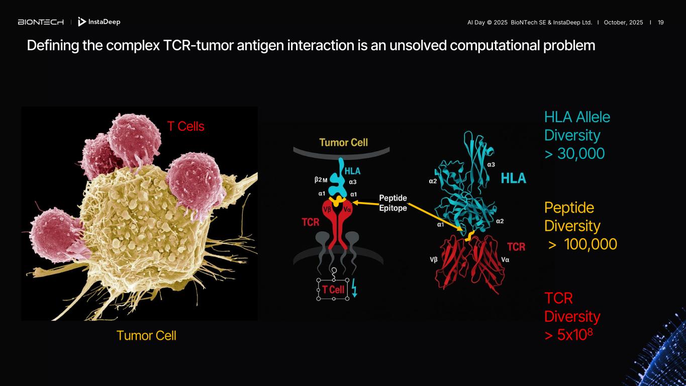 Defining the complex TCR-tumor antigen interaction is an unsolved computational problem Tumor Cell T Cells HLA Allele Diversity > 30,000 TCR Diversity > 5x108 Peptide Diversity > 100,000 AI Day © 2025 BioNTech SE & InstaDeep Ltd. I October, 2025 I 19