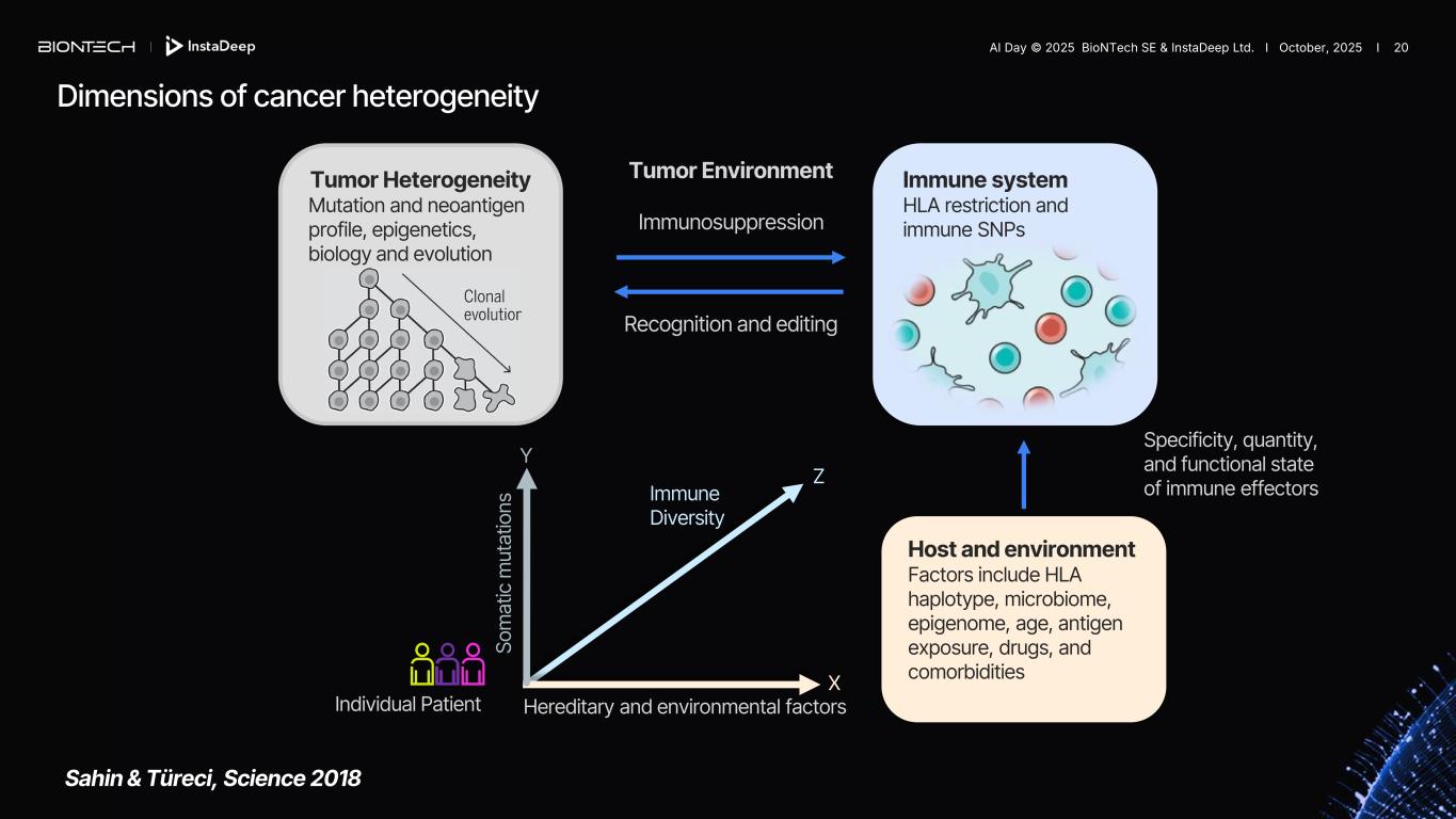 Sahin & Türeci, Science 2018 Tumor Heterogeneity Mutation and neoantigen profile, epigenetics, biology and evolution Immune system HLA restriction and immune SNPs Host and environment Factors include HLA haplotype, microbiome, epigenome, age, antigen exposure, drugs, and comorbidities Tumor Environment Immunosuppression Recognition and editing Individual Patient Specificity, quantity, and functional state of immune effectors Hereditary and environmental factors So m at ic m ut at io ns Immune Diversity Y Z X Dimensions of cancer heterogeneity AI Day © 2025 BioNTech SE & InstaDeep Ltd. I October, 2025 I 20