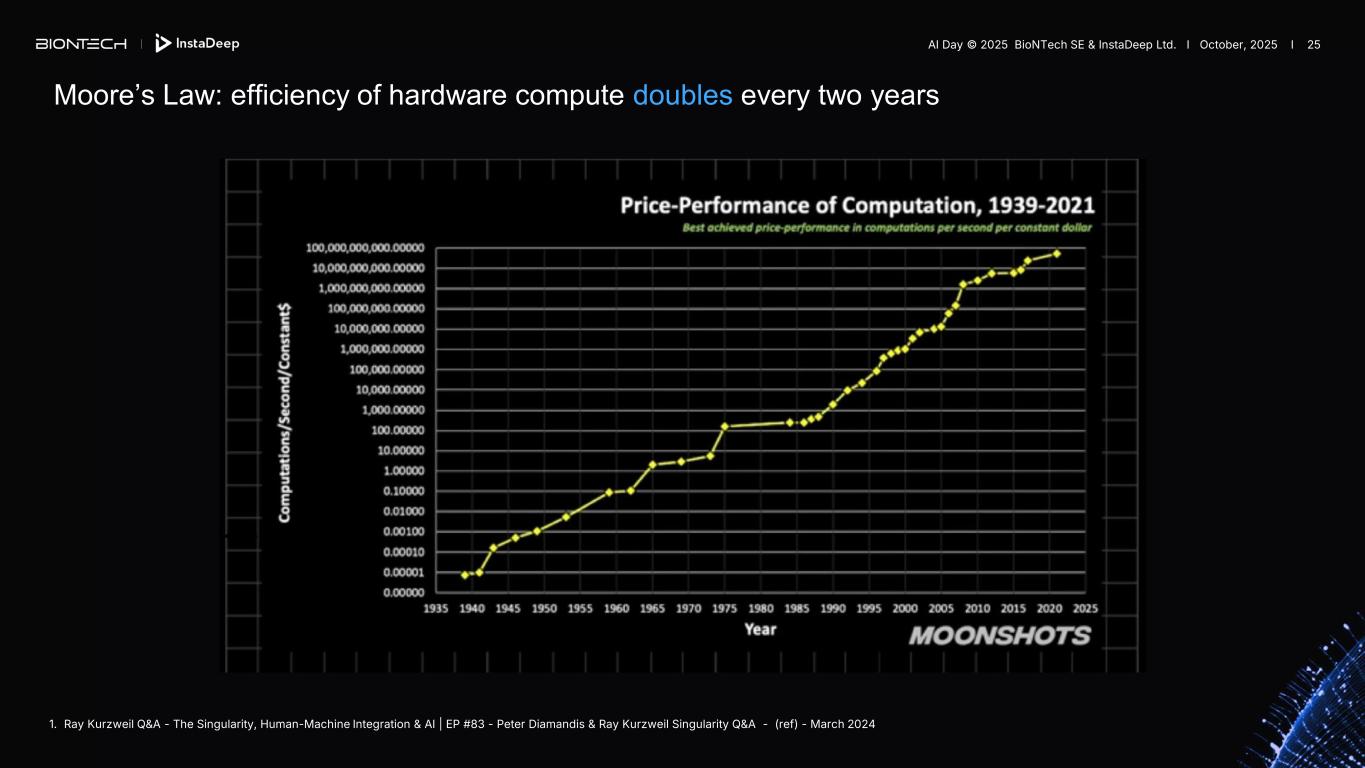 Moore’s Law: efficiency of hardware compute doubles every two years 1. Ray Kurzweil Q&A - The Singularity, Human-Machine Integration & AI | EP #83 - Peter Diamandis & Ray Kurzweil Singularity Q&A - (ref) - March 2024 AI Day © 2025 BioNTech SE & InstaDeep Ltd. I October, 2025 I 25