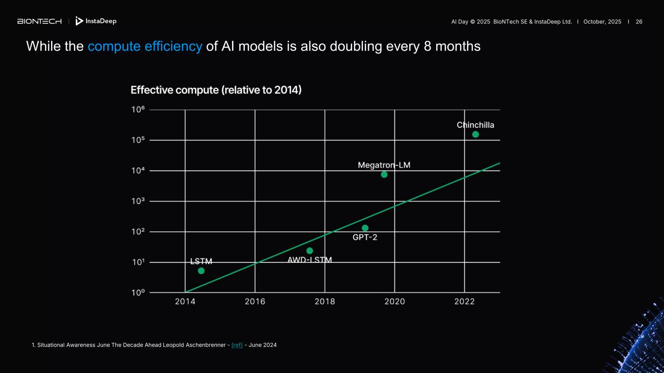 While the compute efficiency of AI models is also doubling every 8 months 1. Situational Awareness June The Decade Ahead Leopold Aschenbrenner - (ref) - June 2024 AI Day © 2025 BioNTech SE & InstaDeep Ltd. I October, 2025 I 26