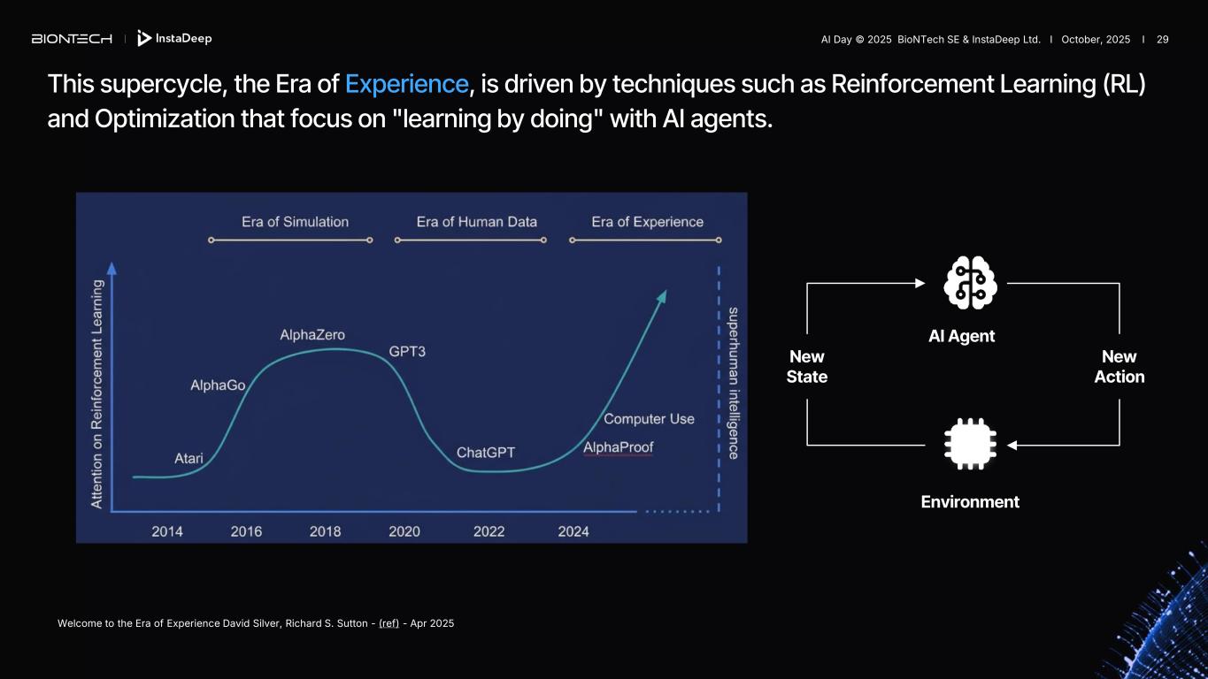 This supercycle, the Era of Experience, is driven by techniques such as Reinforcement Learning (RL) and Optimization that focus on "learning by doing" with AI agents. Welcome to the Era of Experience David Silver, Richard S. Sutton - (ref) - Apr 2025 Environment New State New Action AI Agent AI Day © 2025 BioNTech SE & InstaDeep Ltd. I October, 2025 I 29