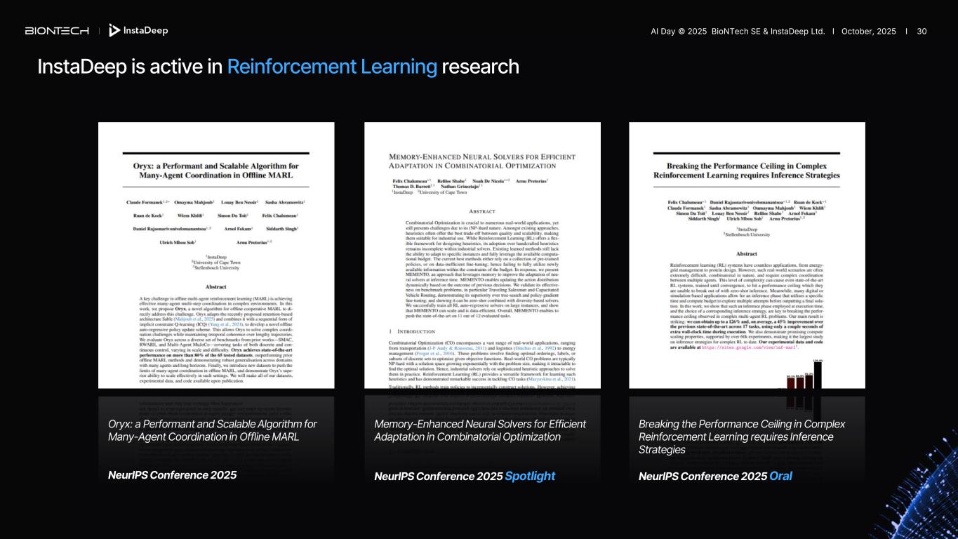 InstaDeep is active in Reinforcement Learning research Oryx: a Performant and Scalable Algorithm for Many-Agent Coordination in Offline MARL NeurIPS Conference 2025 Breaking the Performance Ceiling in Complex Reinforcement Learning requires Inference Strategies NeurIPS Conference 2025 Oral Memory-Enhanced Neural Solvers for Efficient Adaptation in Combinatorial Optimization NeurIPS Conference 2025 Spotlight AI Day © 2025 BioNTech SE & InstaDeep Ltd. I October, 2025 I 30