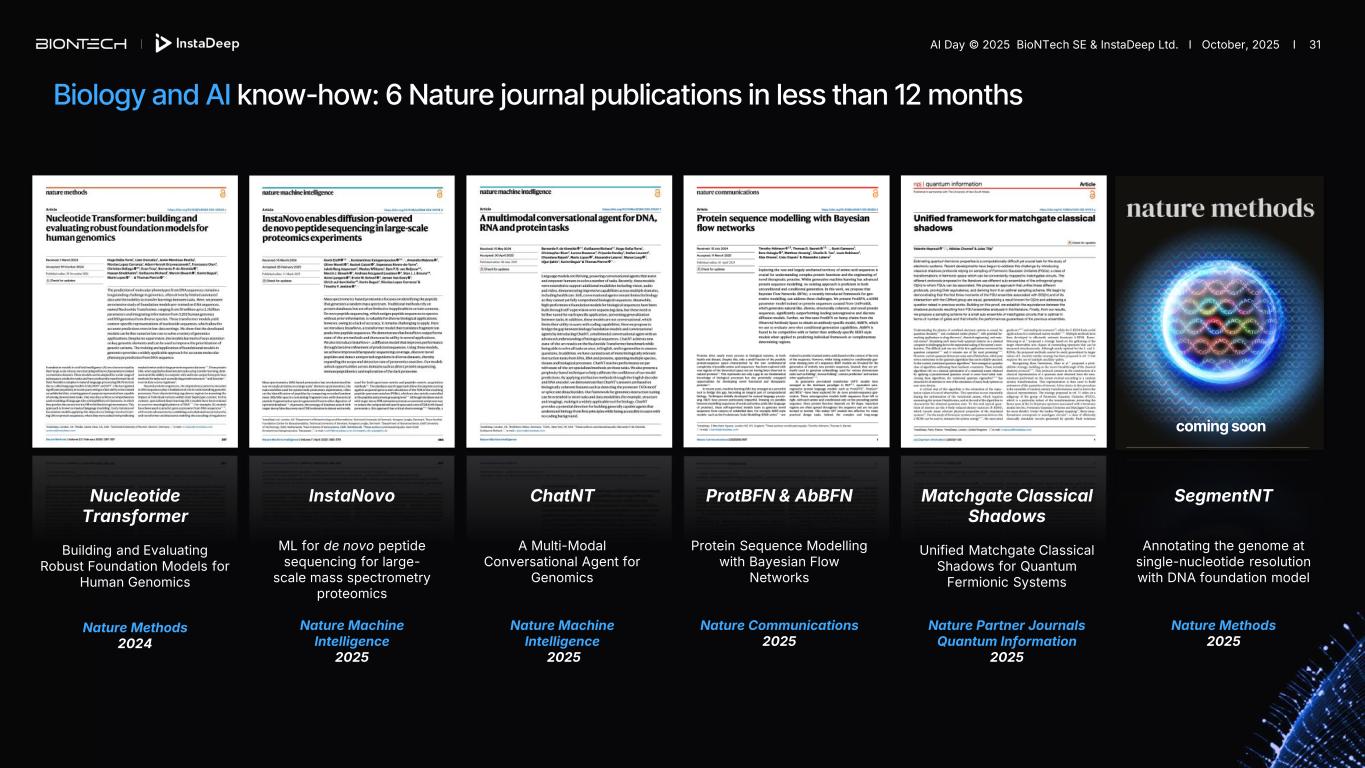 Nucleotide Transformer Building and Evaluating Robust Foundation Models for Human Genomics Nature Methods 2024 ProtBFN & AbBFN Protein Sequence Modelling with Bayesian Flow Networks Nature Communications 2025 ChatNT A Multi-Modal Conversational Agent for Genomics Nature Machine Intelligence 2025 Matchgate Classical Shadows Unified Matchgate Classical Shadows for Quantum Fermionic Systems Nature Partner Journals Quantum Information 2025 InstaNovo ML for de novo peptide sequencing for large- scale mass spectrometry proteomics Nature Machine Intelligence 2025 SegmentNT Annotating the genome at single-nucleotide resolution with DNA foundation model Nature Methods 2025 coming soon Biology and AI know-how: 6 Nature journal publications in less than 12 months AI Day © 2025 BioNTech SE & InstaDeep Ltd. I October, 2025 I 31