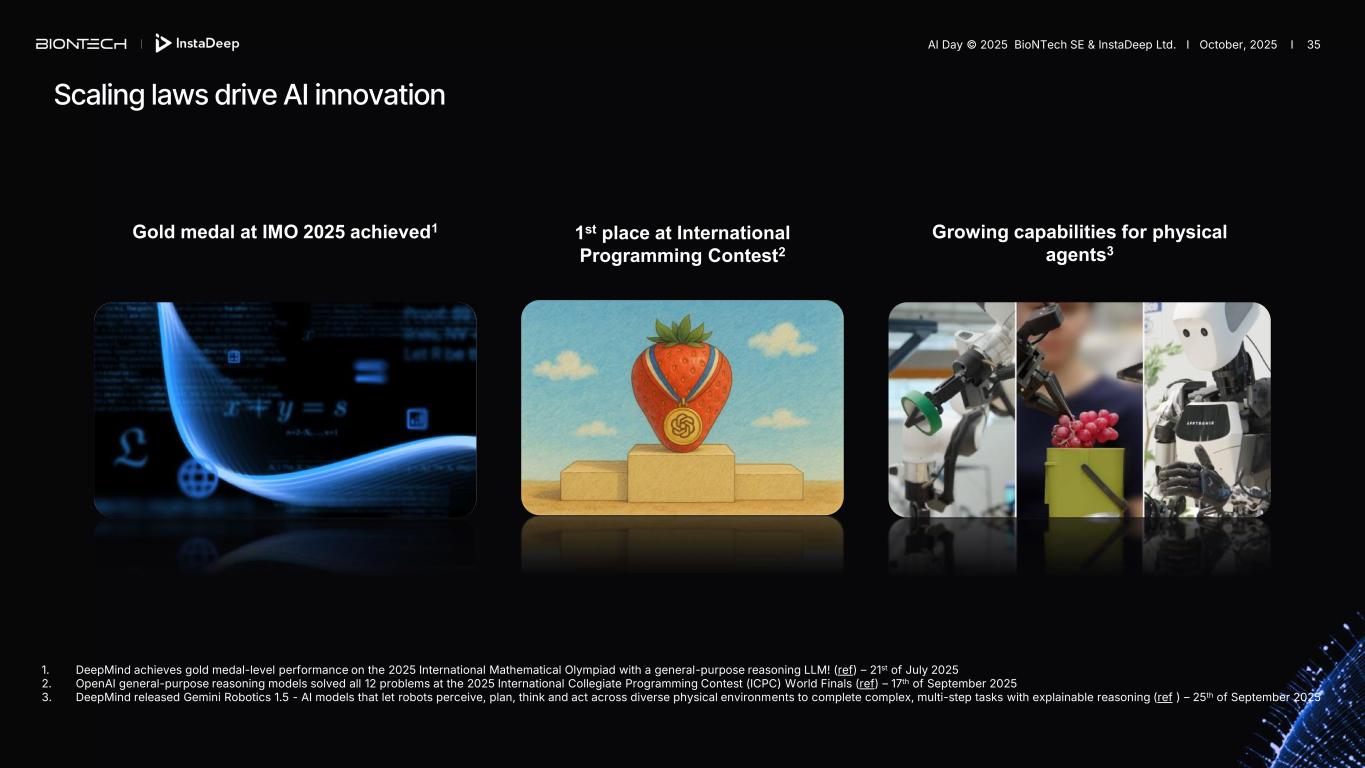 Gold medal at IMO 2025 achieved1 1. DeepMind achieves gold medal-level performance on the 2025 International Mathematical Olympiad with a general-purpose reasoning LLM! (ref) – 21st of July 2025 2. OpenAI general-purpose reasoning models solved all 12 problems at the 2025 International Collegiate Programming Contest (ICPC) World Finals (ref) – 17th of September 2025 3. DeepMind released Gemini Robotics 1.5 - AI models that let robots perceive, plan, think and act across diverse physical environments to complete complex, multi-step tasks with explainable reasoning (ref ) – 25th of September 2025 1st place at International Programming Contest2 Growing capabilities for physical agents3 Scaling laws drive AI innovation AI Day © 2025 BioNTech SE & InstaDeep Ltd. I October, 2025 I 35