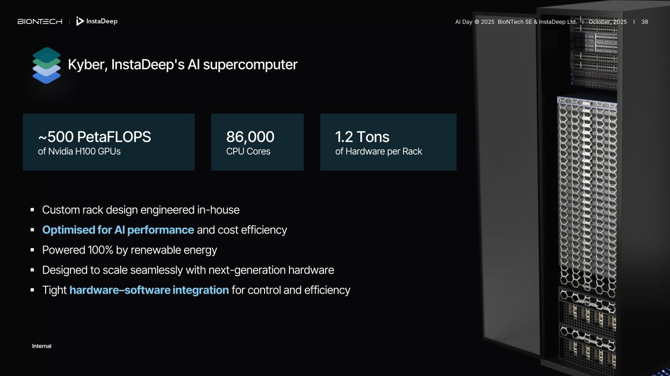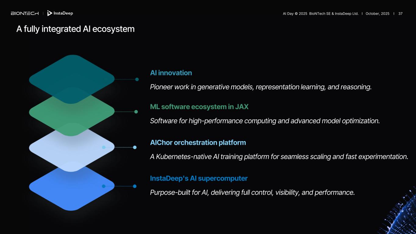 A fully integrated AI ecosystem InstaDeep's AI supercomputer Purpose-built for AI, delivering full control, visibility, and performance. AIChor orchestration platform A Kubernetes-native AI training platform for seamless scaling and fast experimentation. ML software ecosystem in JAX Software for high-performance computing and advanced model optimization. AI innovation Pioneer work in generative models, representation learning, and reasoning. AI Day © 2025 BioNTech SE & InstaDeep Ltd. I October, 2025 I 37