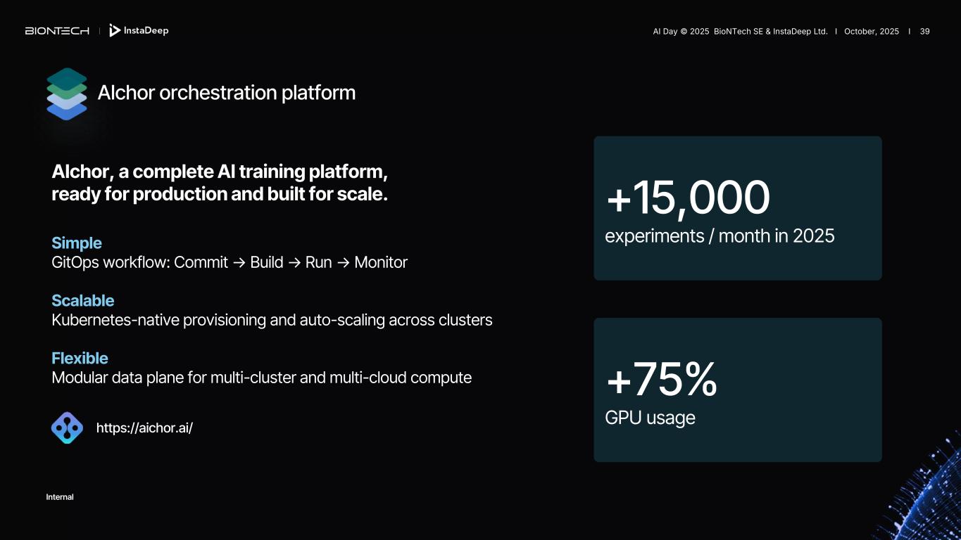 +15,000 experiments / month in 2025 +75% GPU usage Simple GitOps workflow: Commit → Build → Run → Monitor Scalable Kubernetes-native provisioning and auto-scaling across clusters Flexible Modular data plane for multi-cluster and multi-cloud compute AIchor, a complete AI training platform, ready for production and built for scale. AIchor orchestration platform https://aichor.ai/ Internal AI Day © 2025 BioNTech SE & InstaDeep Ltd. I October, 2025 I 39