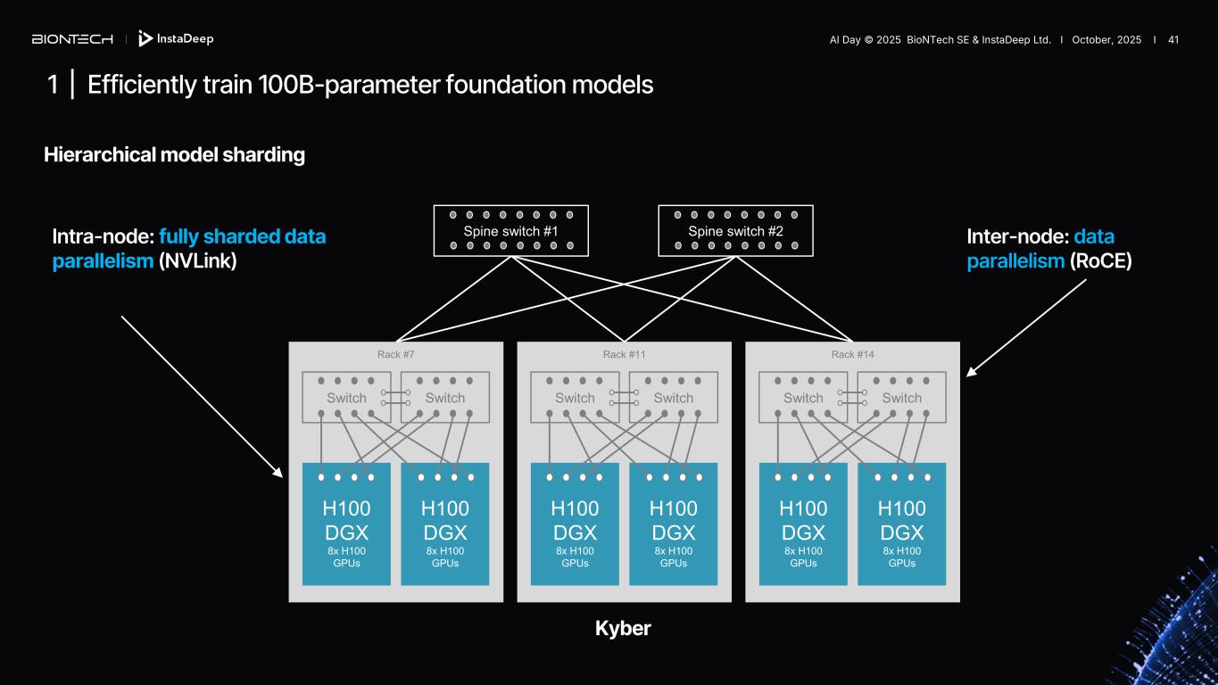 1 | Efficiently train 100B-parameter foundation models Hierarchical model sharding Rack #7 Switch H100 DGX 8x H100 GPUs H100 DGX 8x H100 GPUs Switch Rack #11 Switch H100 DGX 8x H100 GPUs H100 DGX 8x H100 GPUs Switch Rack #14 Switch H100 DGX 8x H100 GPUs H100 DGX 8x H100 GPUs Switch Spine switch #1 Spine switch #2Intra-node: fully sharded data parallelism (NVLink) Kyber Inter-node: data parallelism (RoCE) AI Day © 2025 BioNTech SE & InstaDeep Ltd. I October, 2025 I 41