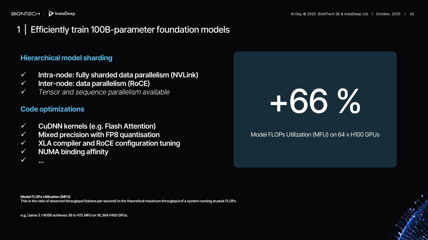1 | Efficiently train 100B-parameter foundation models Hierarchical model sharding ✓ Intra-node: fully sharded data parallelism (NVLink) ✓ Inter-node: data parallelism (RoCE) ✓ Tensor and sequence parallelism available Code optimizations ✓ CuDNN kernels (e.g. Flash Attention) ✓ Mixed precision with FP8 quantisation ✓ XLA compiler and RoCE configuration tuning ✓ NUMA binding affinity ✓ … Model FLOPs Utilization (MFU) This is the ratio of observed throughput (tokens per second) to the theoretical maximum throughput of a system running at peak FLOPs. e.g, Llama 3.1 405B achieves 38 to 41% MFU on 16,384 H100 GPUs. +66 % Model FLOPs Utilization (MFU) on 64 x H100 GPUs AI Day © 2025 BioNTech SE & InstaDeep Ltd. I October, 2025 I 42