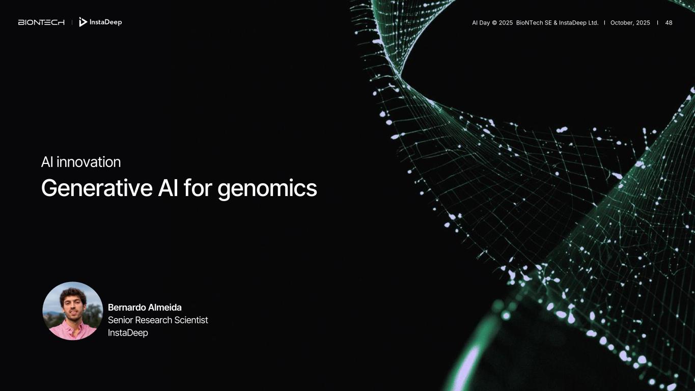 AI innovation Generative AI for genomics Bernardo Almeida Senior Research Scientist InstaDeep AI Day © 2025 BioNTech SE & InstaDeep Ltd. I October, 2025 I 48