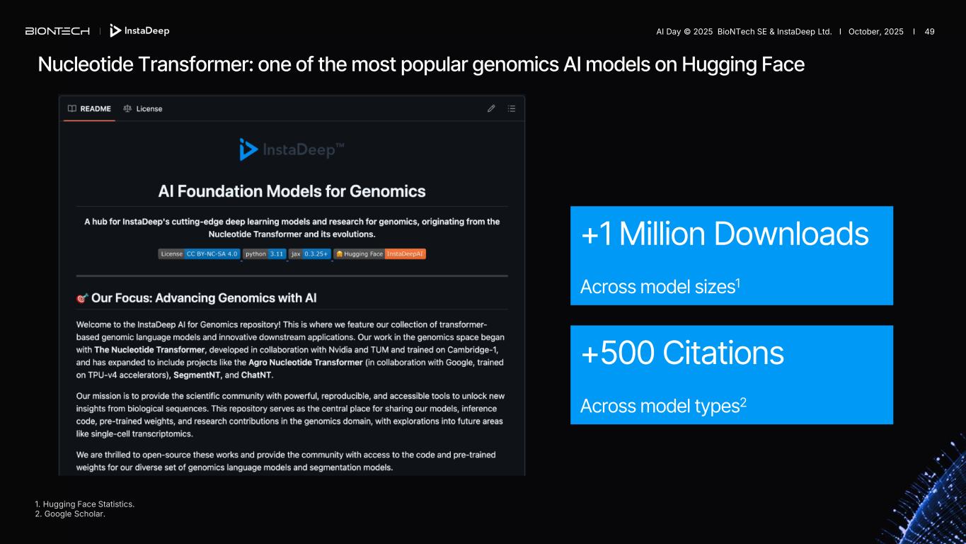 +1 Million Downloads Across model sizes1 +500 Citations Across model types2 1. Hugging Face Statistics. 2. Google Scholar. Nucleotide Transformer: one of the most popular genomics AI models on Hugging Face AI Day © 2025 BioNTech SE & InstaDeep Ltd. I October, 2025 I 49