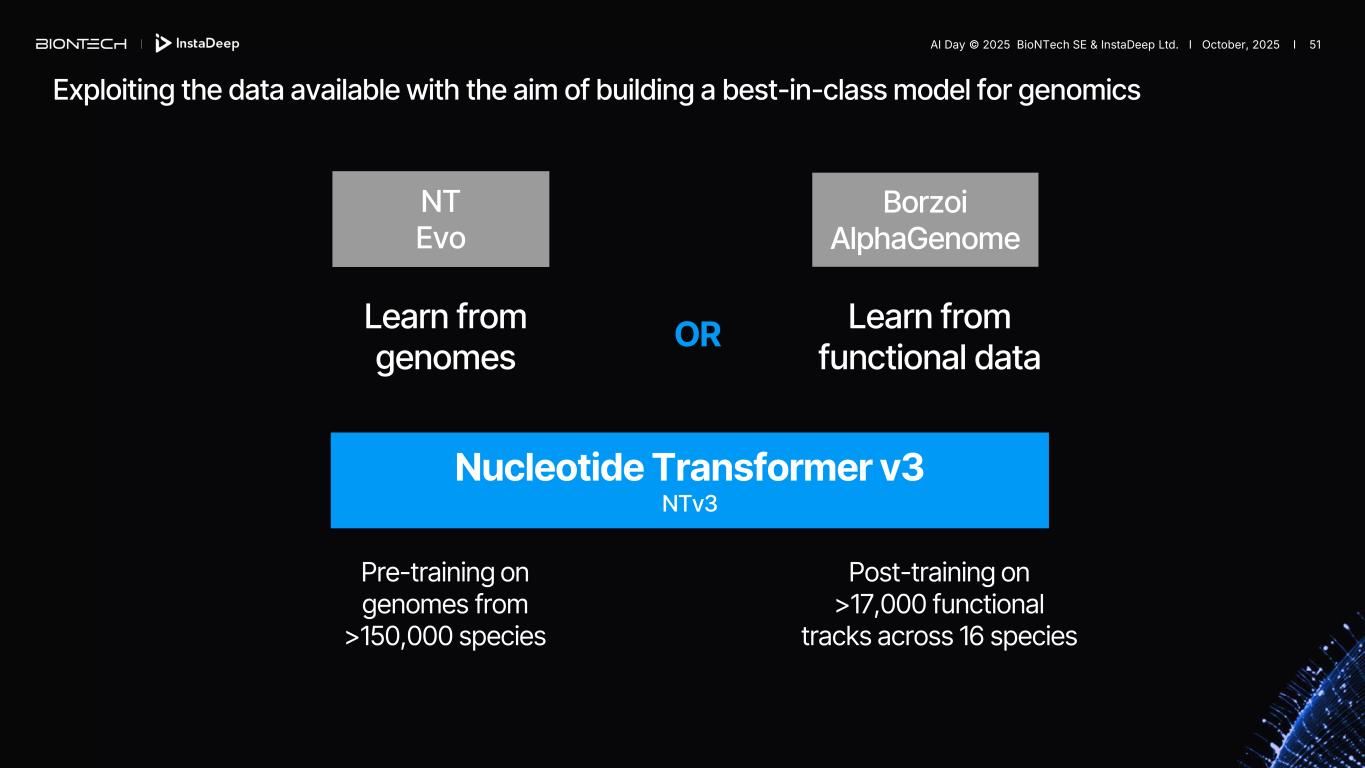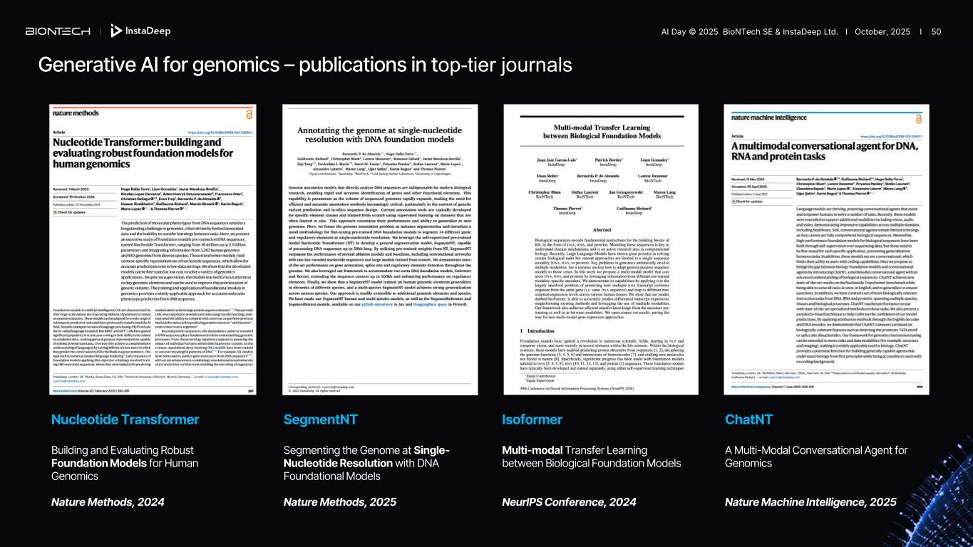 Generative AI for genomics – publications in top-tier journals Nucleotide Transformer Building and Evaluating Robust Foundation Models for Human Genomics Nature Methods, 2024 SegmentNT Segmenting the Genome at Single- Nucleotide Resolution with DNA Foundational Models Nature Methods, 2025 Isoformer Multi-modal Transfer Learning between Biological Foundation Models NeurIPS Conference, 2024 ChatNT A Multi-Modal Conversational Agent for Genomics Nature Machine Intelligence, 2025 AI Day © 2025 BioNTech SE & InstaDeep Ltd. I October, 2025 I 50