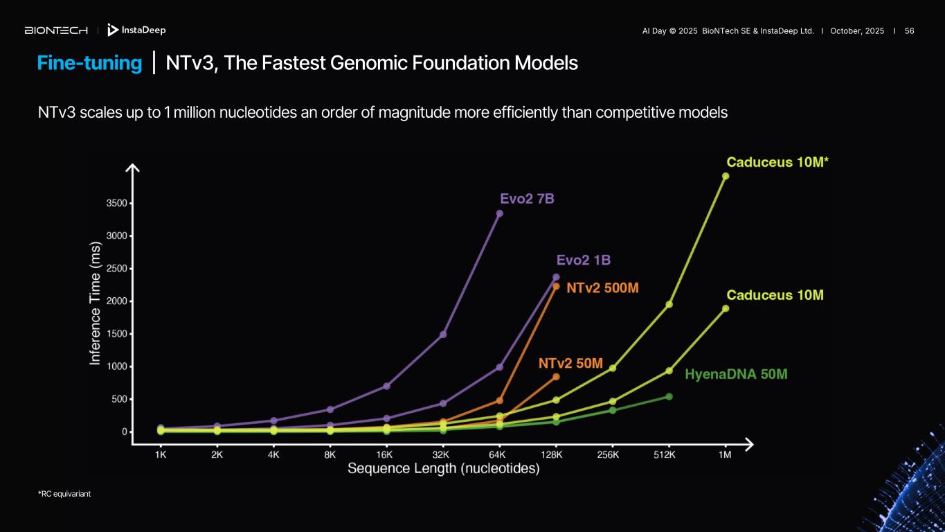 Fine-tuning | NTv3, The Fastest Genomic Foundation Models NTv3 scales up to 1 million nucleotides an order of magnitude more efficiently than competitive models *RC equivariant AI Day © 2025 BioNTech SE & InstaDeep Ltd. I October, 2025 I 56