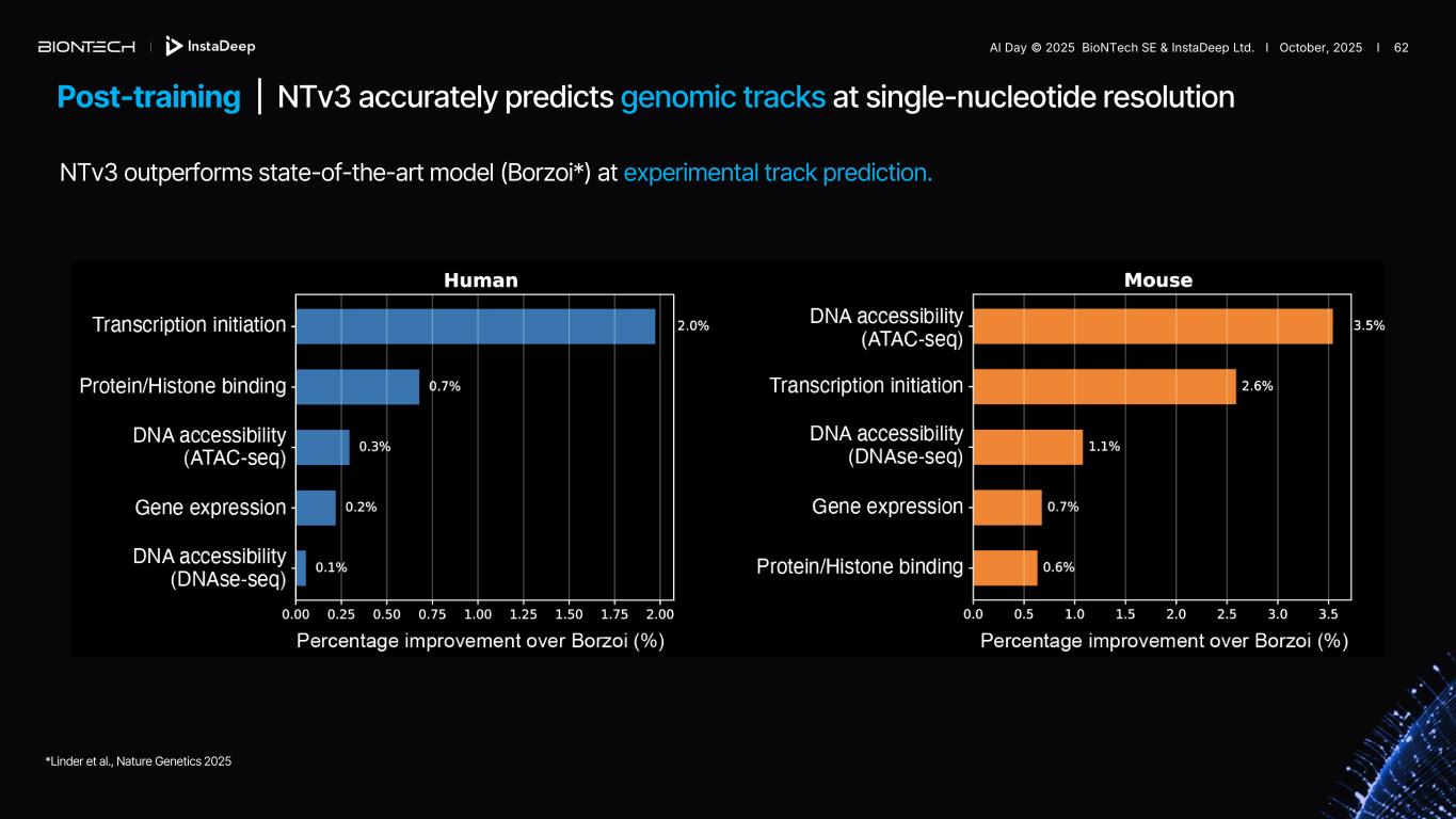 Post-training | NTv3 accurately predicts genomic tracks at single-nucleotide resolution *Linder et al., Nature Genetics 2025 NTv3 outperforms state-of-the-art model (Borzoi*) at experimental track prediction. AI Day © 2025 BioNTech SE & InstaDeep Ltd. I October, 2025 I 62