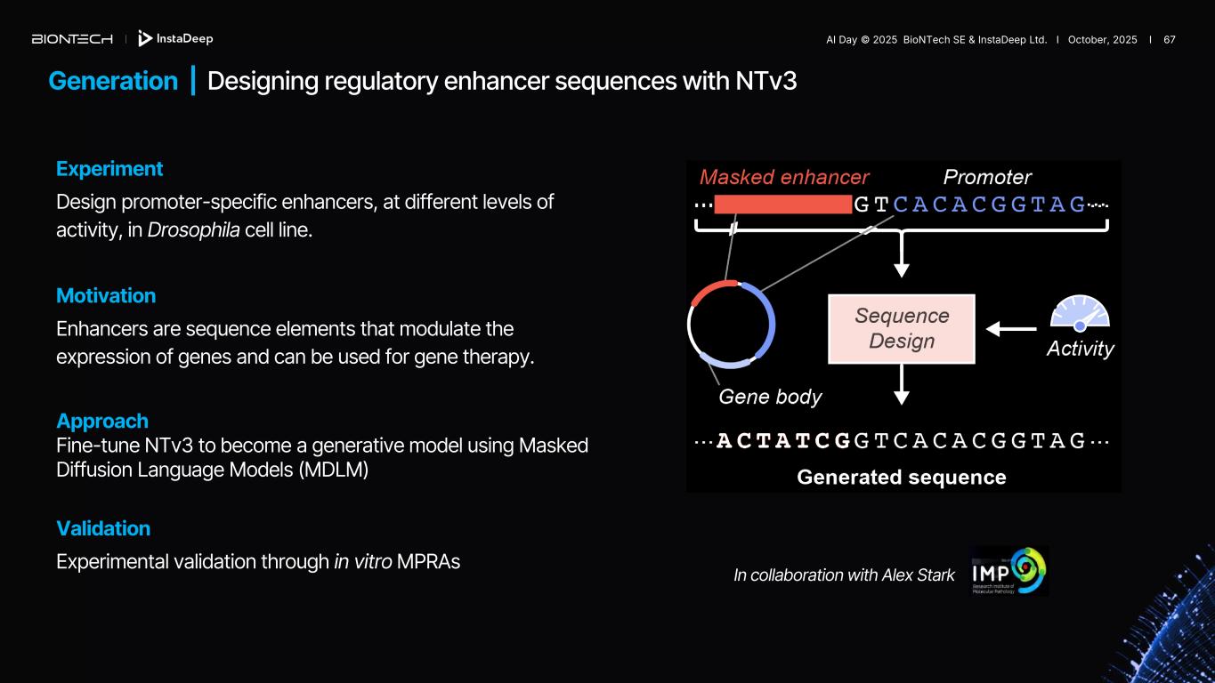 Generation | Designing regulatory enhancer sequences with NTv3 In collaboration with Alex Stark Experiment Design promoter-specific enhancers, at different levels of activity, in Drosophila cell line. Motivation Enhancers are sequence elements that modulate the expression of genes and can be used for gene therapy. Approach Fine-tune NTv3 to become a generative model using Masked Diffusion Language Models (MDLM) Validation Experimental validation through in vitro MPRAs AI Day © 2025 BioNTech SE & InstaDeep Ltd. I October, 2025 I 67