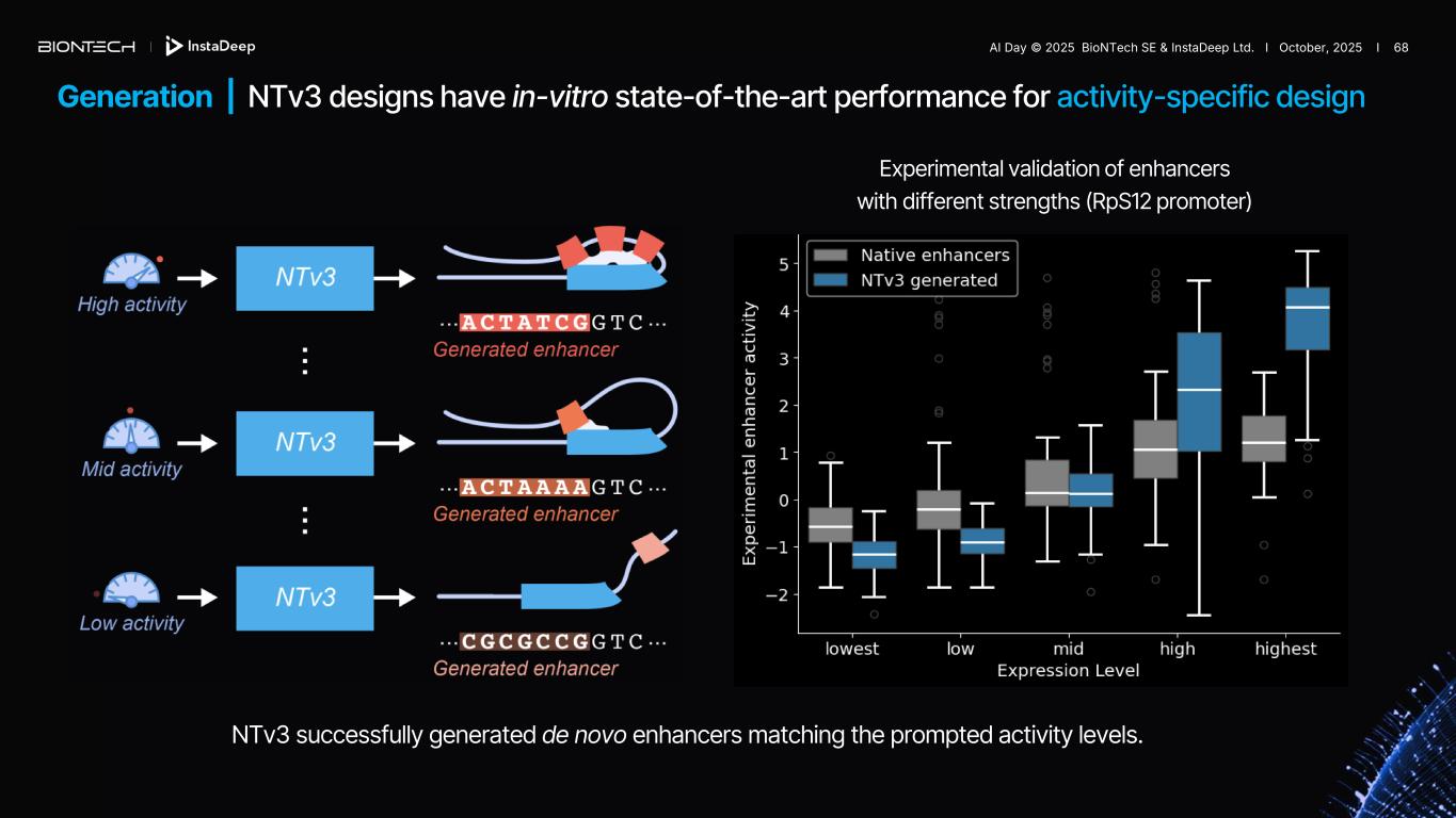 Generation | NTv3 designs have in-vitro state-of-the-art performance for activity-specific design Experimental validation of enhancers with different strengths (RpS12 promoter) NTv3 successfully generated de novo enhancers matching the prompted activity levels. AI Day © 2025 BioNTech SE & InstaDeep Ltd. I October, 2025 I 68