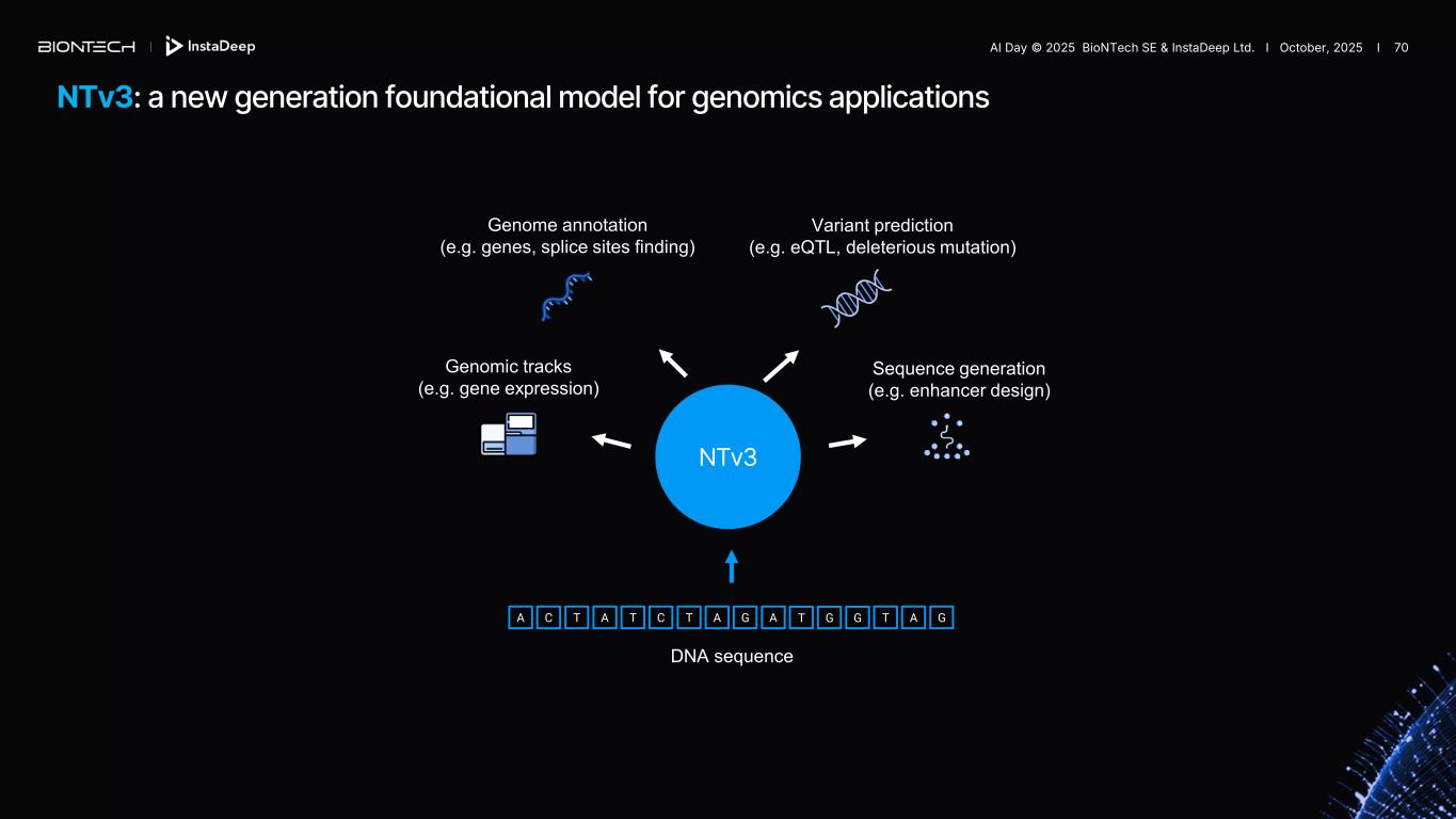 Generation | NTv3 designs have in-vitro state-of-the-art performance for promoter-specific design Experimental validation of enhancers with promoter-specific activities *de Almeida et al., Nature Genetics 2023 NTv3 successfully generated de novo promoter-specific enhancers, achieving fold-change specificity significantly superior to previously validated state-of-the-art in vitro methods. AI Day © 2025 BioNTech SE & InstaDeep Ltd. I October, 2025 I 69
