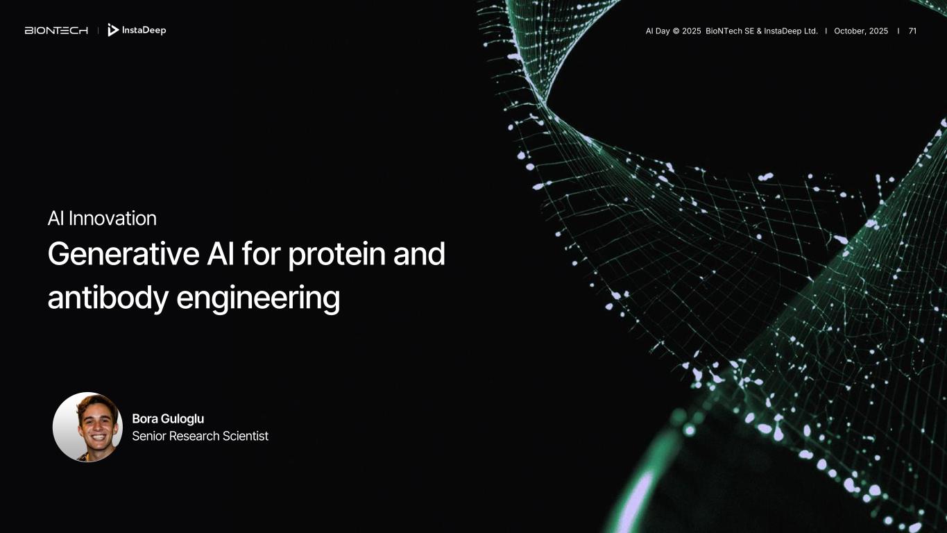 AI Innovation Generative AI for protein and antibody engineering Bora Guloglu Senior Research Scientist AI Day © 2025 BioNTech SE & InstaDeep Ltd. I October, 2025 I 71