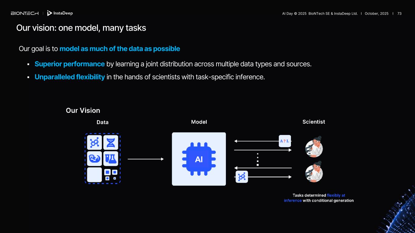AGL… AI (BFN-X) Our goal is to model as much of the data as possible ▪ Superior performance by learning a joint distribution across multiple data types and sources. ▪ Unparalleled flexibility in the hands of scientists with task-specific inference. Our vision: one model, many tasks AI AI Day © 2025 BioNTech SE & InstaDeep Ltd. I October, 2025 I 73