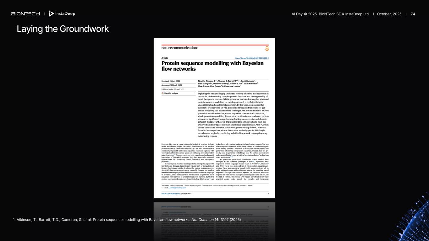 AGL… AI (BFN-X) Laying the Groundwork 1. Atkinson, T., Barrett, T.D., Cameron, S. et al. Protein sequence modelling with Bayesian flow networks. Nat Commun 16, 3197 (2025) AI Day © 2025 BioNTech SE & InstaDeep Ltd. I October, 2025 I 74