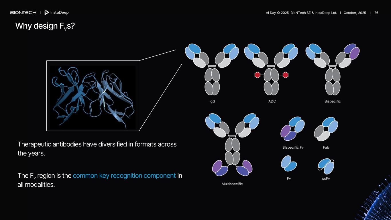 Why design Fvs? Therapeutic antibodies have diversified in formats across the years. The Fv region is the common key recognition component in all modalities. AI Day © 2025 BioNTech SE & InstaDeep Ltd. I October, 2025 I 76